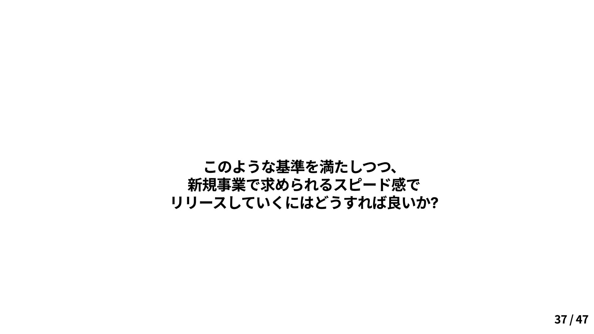 このような基準を満たしつつ、 新規事業で求められるスピード感で リリースしていくにはどうすれば良いか? 37 / 47