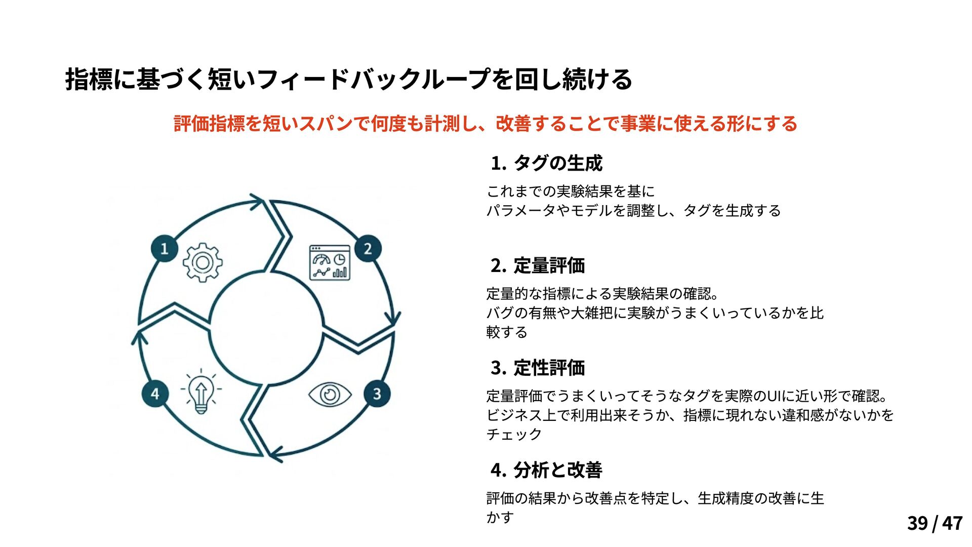 ビジネス上で利用出来そうか、指標に現れない違和感がないかを チェック 分析と改善 評価の結果から改善点を特定し、生成精度の改善に生 かす 指標に基づく短いフィードバックループを回し続ける 評価指標を短いスパンで何度も計測し、改善することで事業に使える形にする 39 / 47