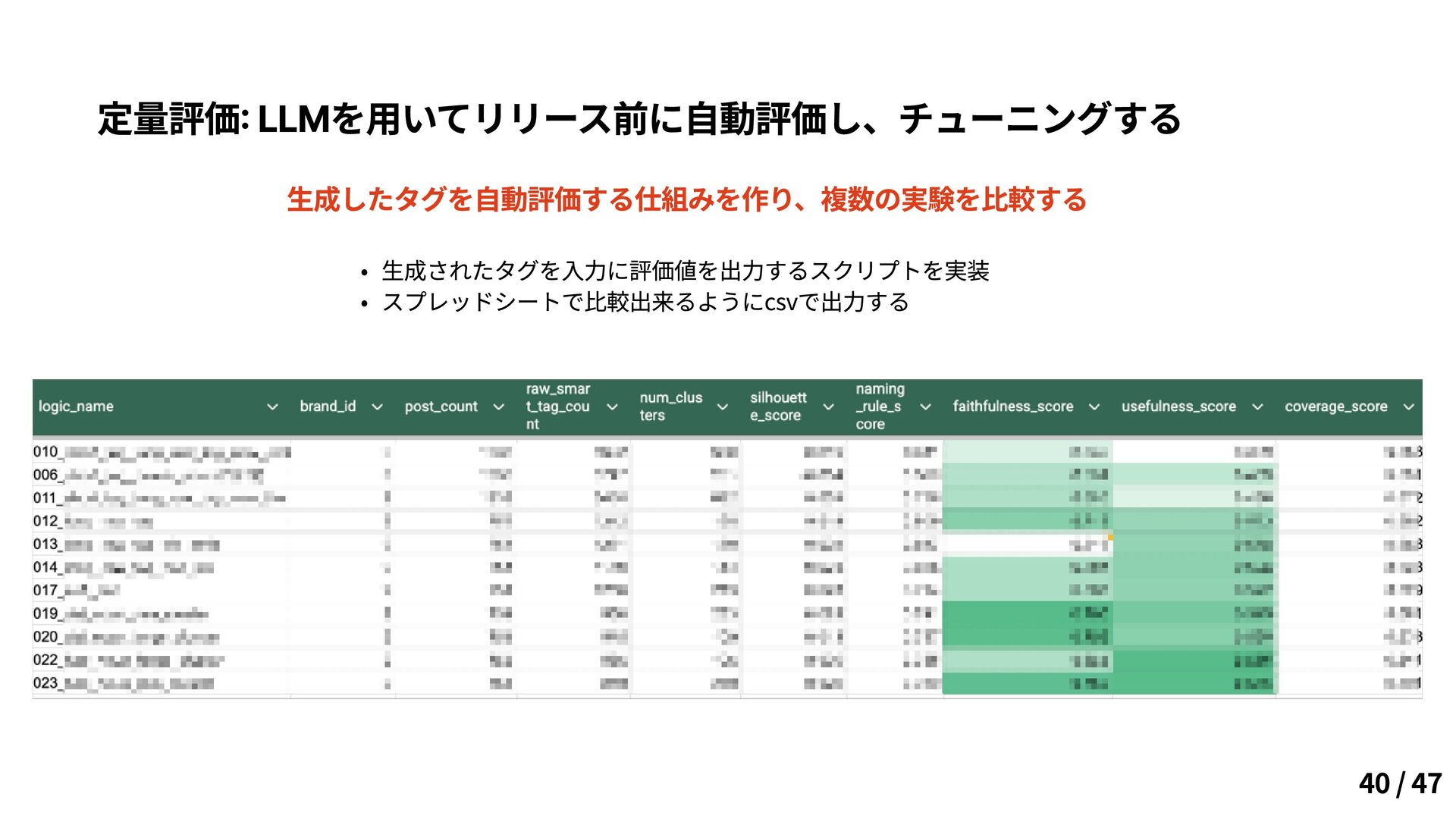 定量評価: LLMを用いてリリース前に自動評価し、チューニングする 生成したタグを自動評価する仕組みを作り、複数の実験を比較する 生成されたタグを入力に評価値を出力するスクリプトを実装 スプレッドシートで比較出来るようにcsvで出力する 40 / 47