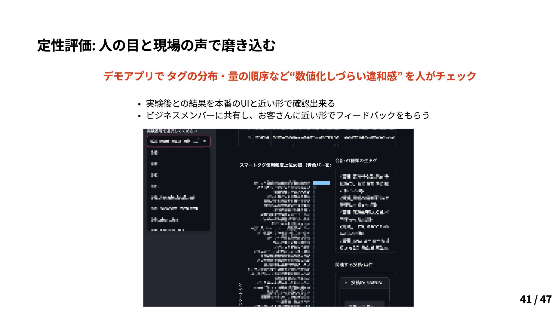 定性評価: 人の目と現場の声で磨き込む デモアプリで タグの分布・量の順序など“数値化しづらい違和感” を人がチェック 実験後との結果を本番のUIと近い形で確認出来る ビジネスメンバーに共有し、お客さんに近い形でフィードバックをもらう 41 / 47