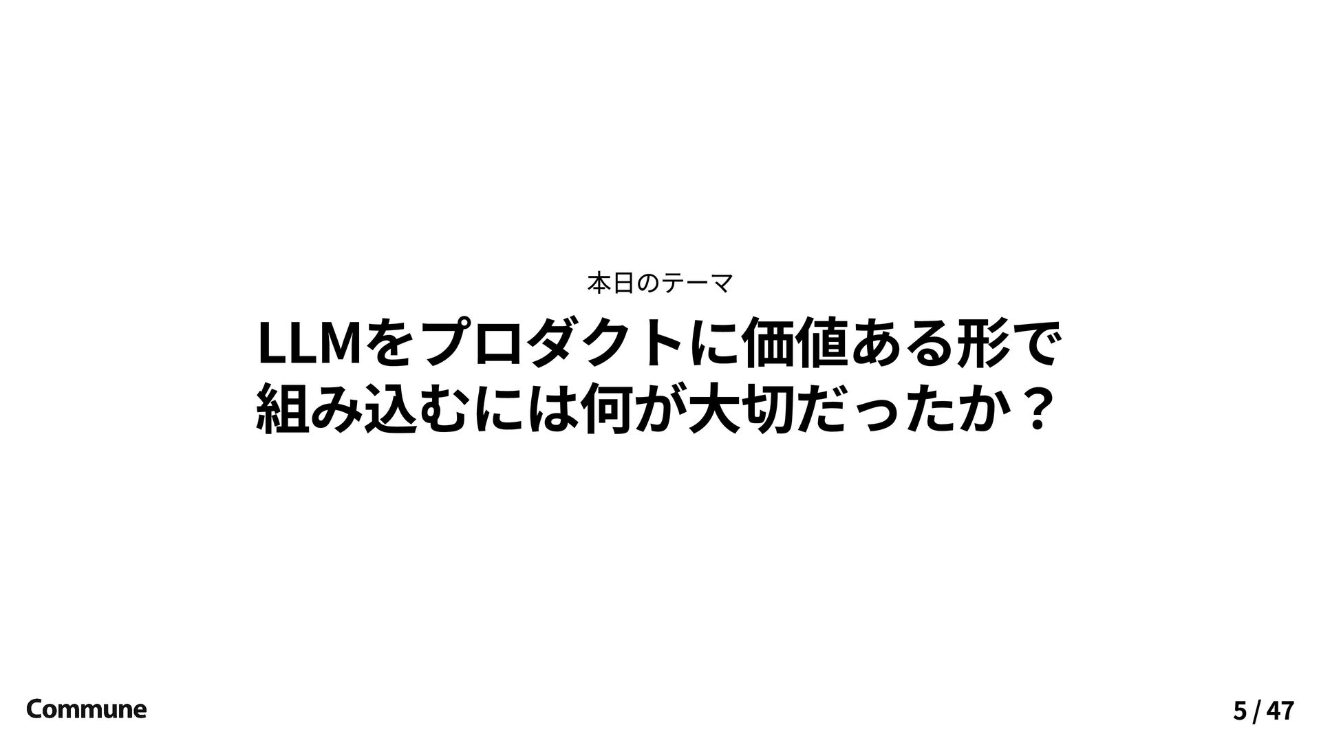 LLMをプロダクトに価値ある形で 組み込むには何が大切だったか? 本日のテーマ 5 / 47
