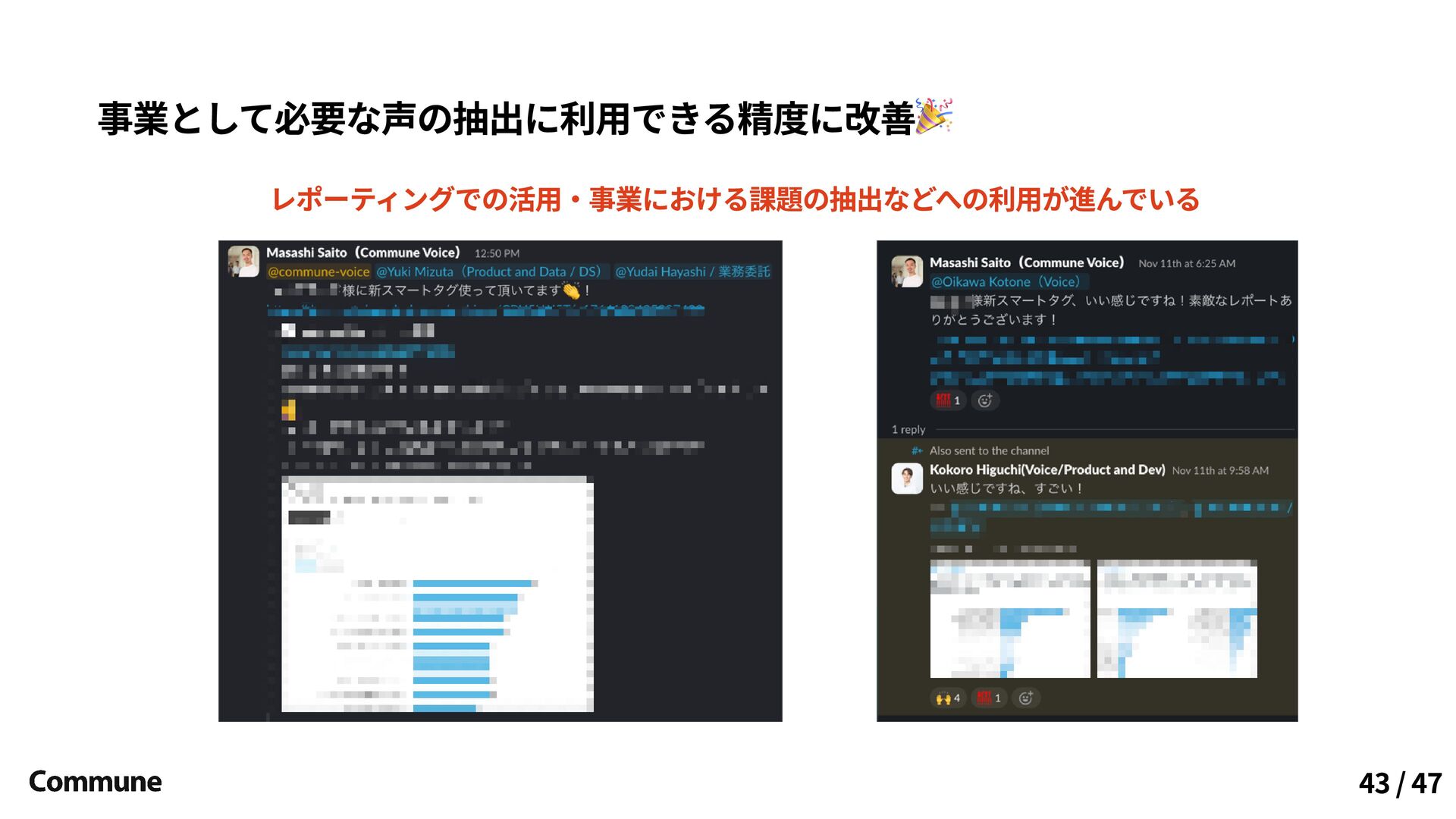 事業として必要な声の抽出に利用できる精度に改善 レポーティングでの活用・事業における課題の抽出などへの利用が進んでいる 43 / 47