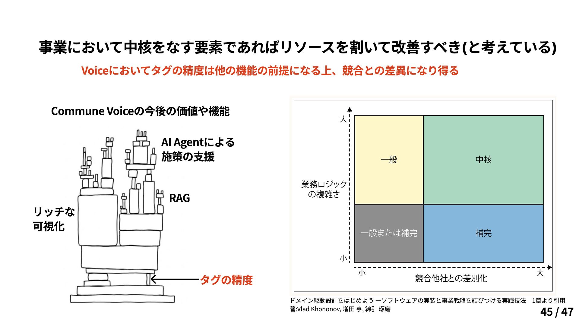 事業において中核をなす要素であればリソースを割いて改善すべき(と考えている) Voiceにおいてタグの精度は他の機能の前提になる上、競合との差異になり得る ドメイン駆動設計をはじめよう ―ソフトウェアの実装と事業戦略を結びつける実践技法 1章より引用 著:Vlad Khononov, 増田 亨, 綿引 琢磨