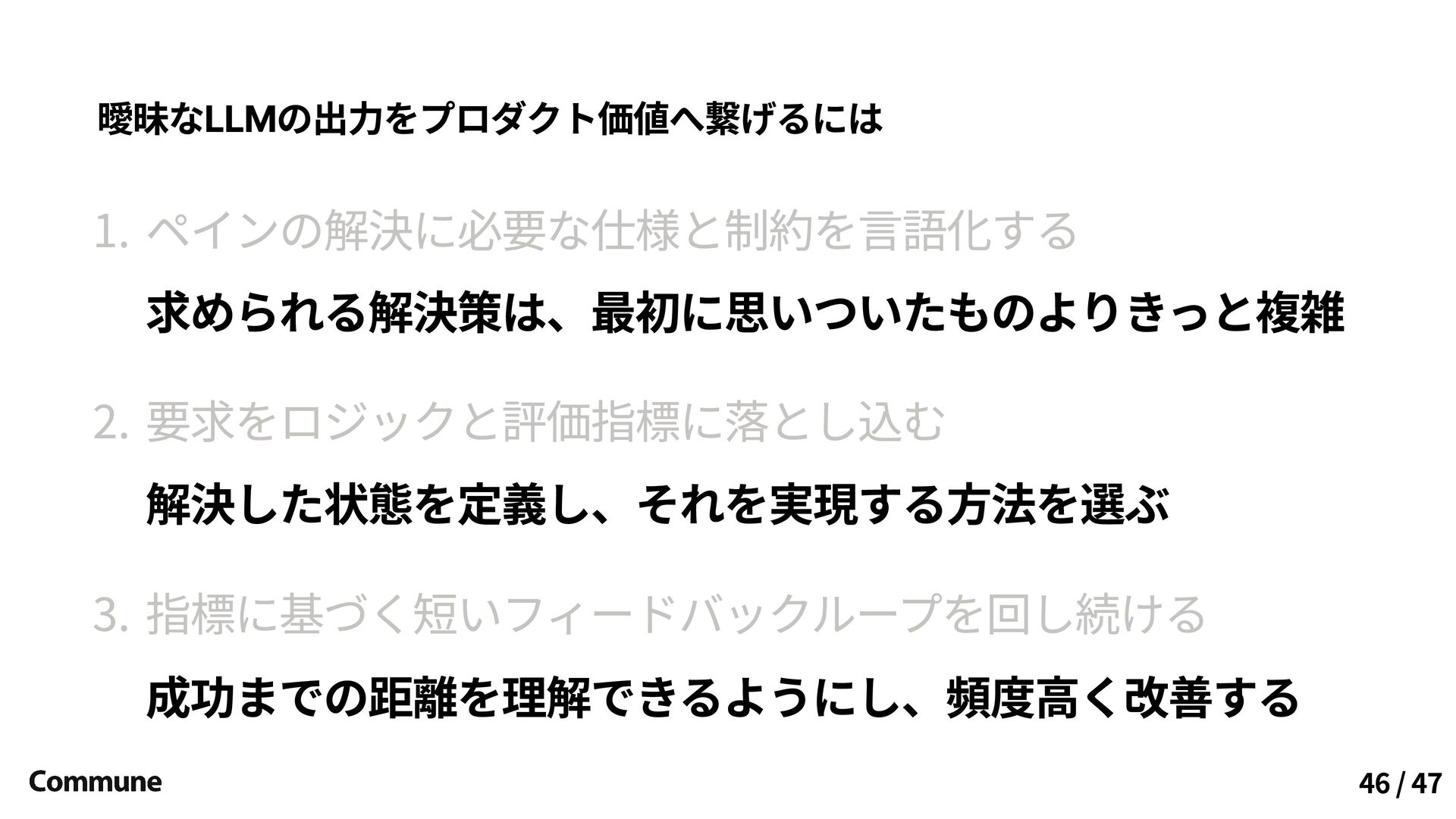曖昧なLLMの出力をプロダクト価値へ繋げるには ペインの解決に必要な仕様と制約を言語化する 求められる解決策は、最初に思いついたものよりきっと複雑 要求をロジックと評価指標に落とし込む 解決した状態を定義し、それを実現する方法を選ぶ 指標に基づく短いフィードバックループを回し続ける 成功までの距離を理解できるようにし、頻度高く改善する 46 / 47
