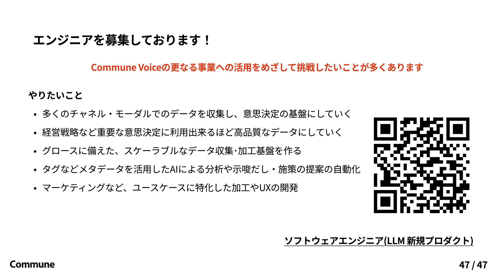 エンジニアを募集しております! 47 / 47 ソフトウェアエンジニア(LLM 新規プロダクト) Commune Voiceの更なる事業への活用をめざして挑戦したいことが多くあります やりたいこと 多くのチャネル・モーダルでのデータを収集し、意思決定の基盤にしていく