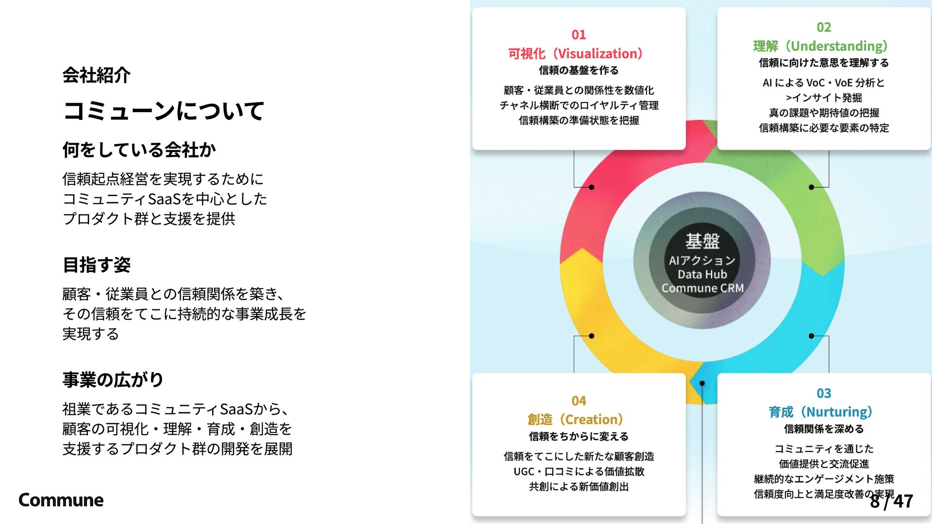 会社紹介 コミューンについて 目指す姿 顧客・従業員との信頼関係を築き、 その信頼をてこに持続的な事業成長を 実現する 事業の広がり 祖業であるコミュニティSaaSから、 顧客の可視化・理解・育成・創造を 支援するプロダクト群の開発を展開