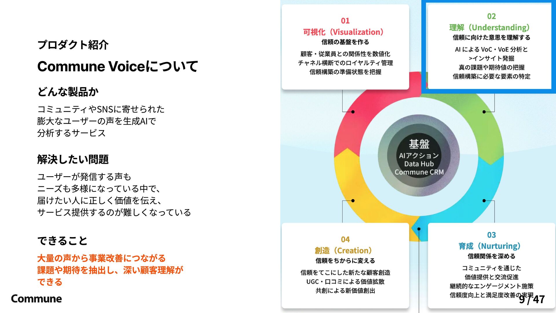 プロダクト紹介 Commune Voiceについて どんな製品か コミュニティやSNSに寄せられた 膨大なユーザーの声を生成AIで 分析するサービス できること 大量の声から事業改善につながる 課題や期待を抽出し、深い顧客理解が
