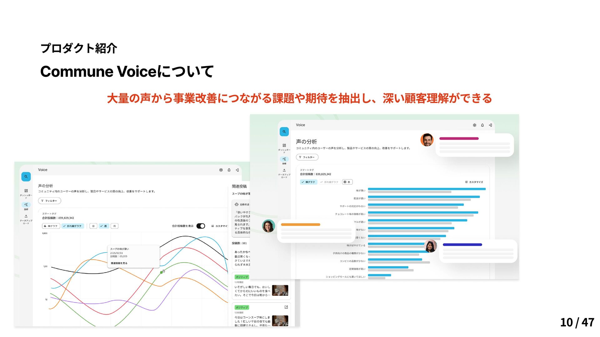 プロダクト紹介 Commune Voiceについて 大量の声から事業改善につながる課題や期待を抽出し、深い顧客理解ができる 10 / 47