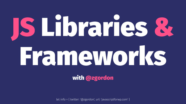 ) { let post = getPostBySlug( about ); displayPost( post, 'page.html' ); } // Event listeners here too.. let info = { twitter: '@zgordon', url: 'javascriptforwp.com' }