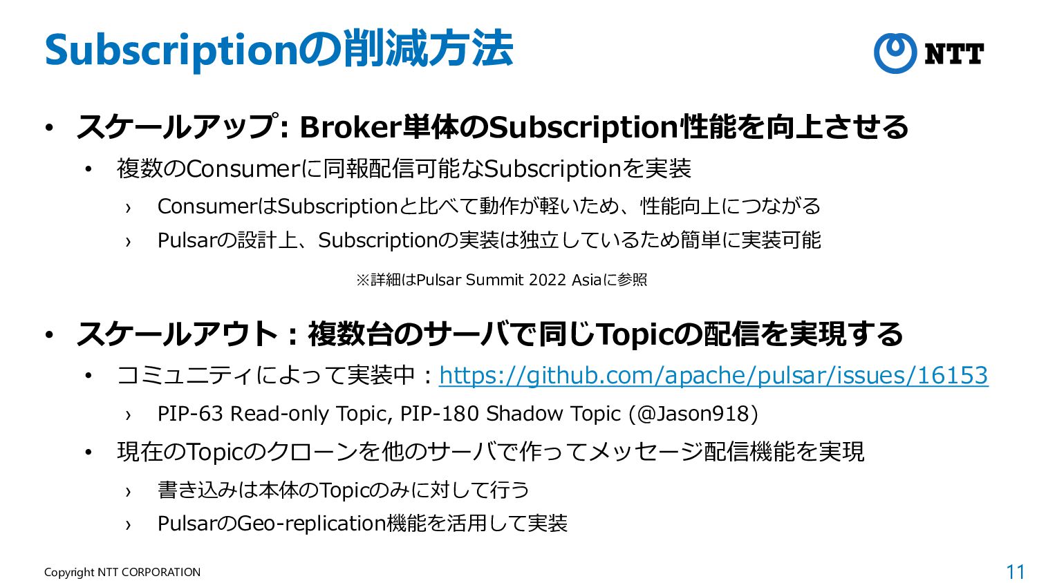 › ConsumerはSubscriptionと比べて動作が軽いため、性能向上につながる › Pulsarの設計上、Subscriptionの実装は独立しているため簡単に実装可能 • スケールアウト:複数台のサーバで同じTopicの配信を実現する • コミュニティによって実装中:https://github.com/apache/pulsar/issues/16153 › PIP-63 Read-only Topic, PIP-180 Shadow Topic (@Jason918) • 現在のTopicのクローンを他のサーバで作ってメッセージ配信機能を実現 › 書き込みは本体のTopicのみに対して行う › PulsarのGeo-replication機能を活用して実装 ※詳細はPulsar Summit 2022 Asiaに参照