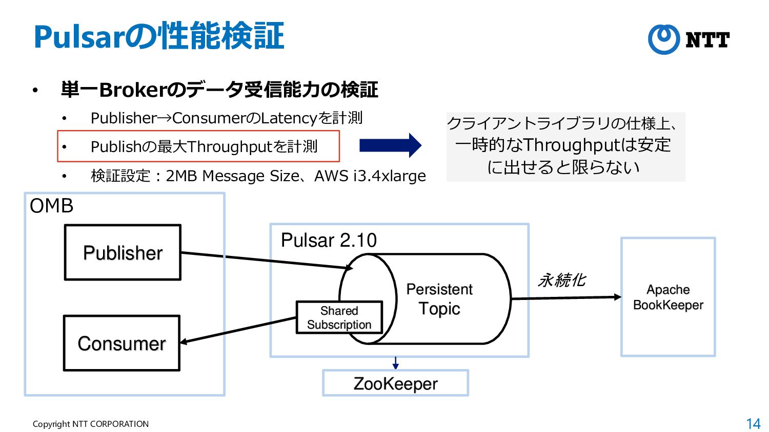 14 Copyright NTT CORPORATION Pulsarの性能検証 • 単一Brokerのデータ受信能力の検証 • Publisher→ConsumerのLatencyを計測 •