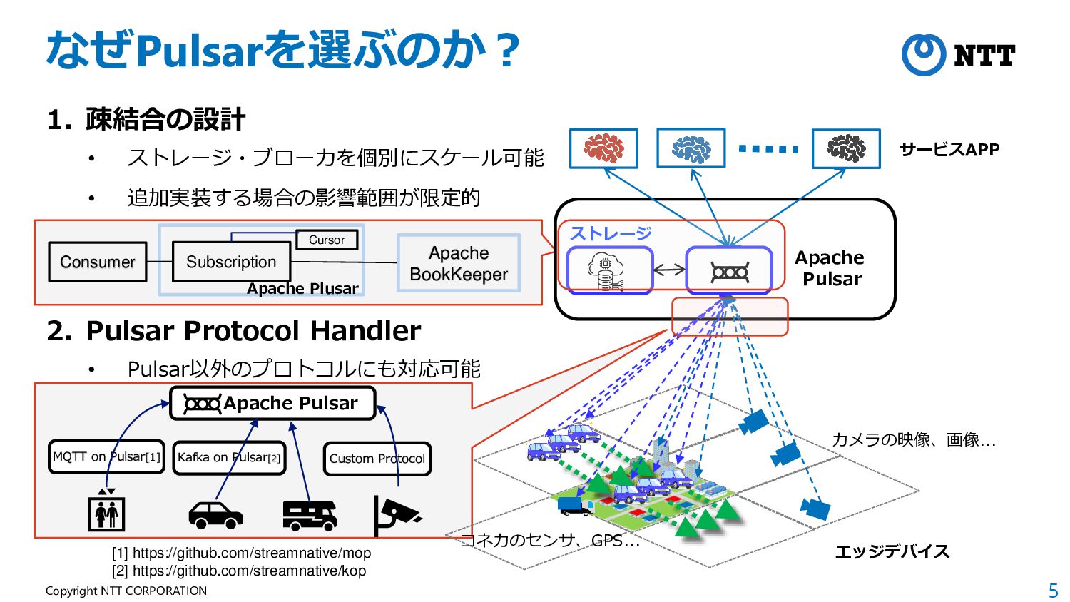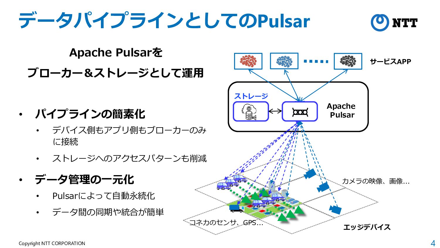 4 Copyright NTT CORPORATION データパイプラインとしてのPulsar サービスAPP エッジデバイス コネカのセンサ、GPS... カメラの映像、画像... Apache