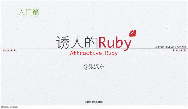 验收测试 Acceptance Test 集成测试 Integration Test TDD/BDD 单元测试 Unit Test ⽤用户故事 User Story Cucumber (Rspec stories) MiniTest::Unit(TDD) Rspec/MiniTest:spec(BDD) 加速(sleep up) spork/guard-spork ⾃自动化(auto) guard 辅助(othres) Mocha/Factorygirl 持续集成(CI) Travis-CI / CruiseControl Rspec(features spec) MiniTest features 13年11月10⽇日星期⽇日