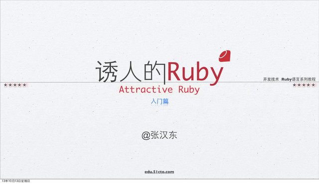线程的⽣生命周期 lifecycle of a thread Thread.new 准备就绪 ready Thread.join 执⾏行 Run Thread.stop 睡眠 sleep Thread.wakeup 消亡 End Run Dead Sleep Sleep/ Run 异常 Exception Nil False be killed finished Aborting runing fail 13年10月13⽇日星期⽇日