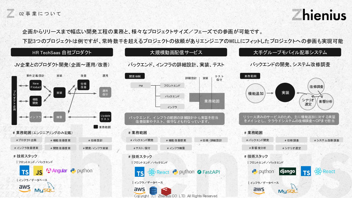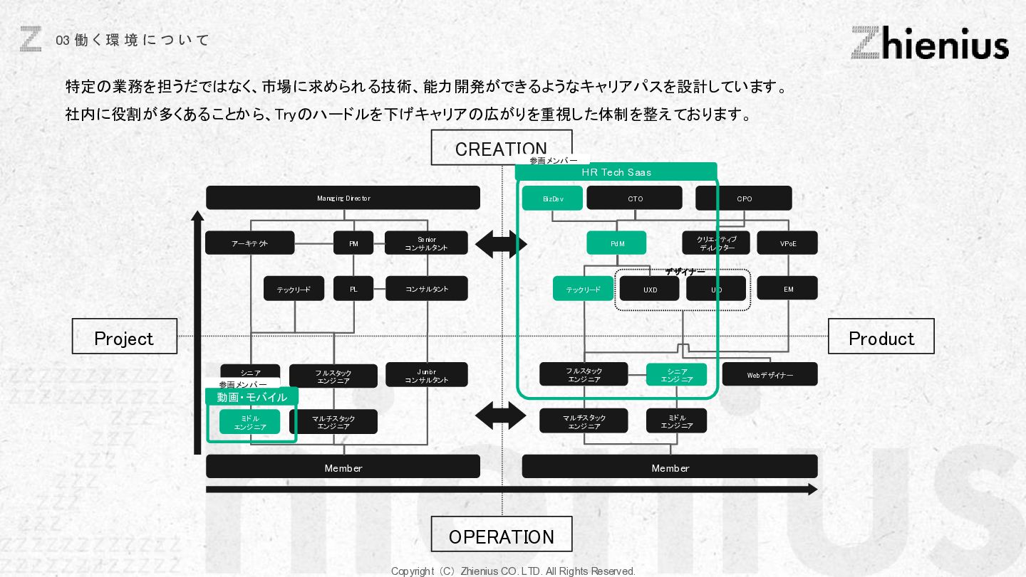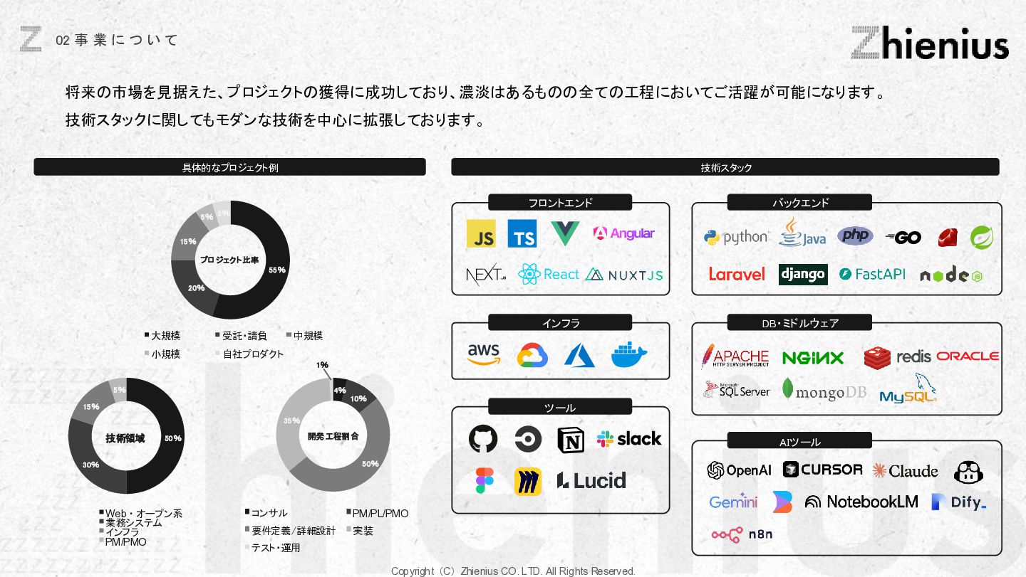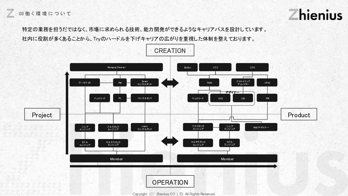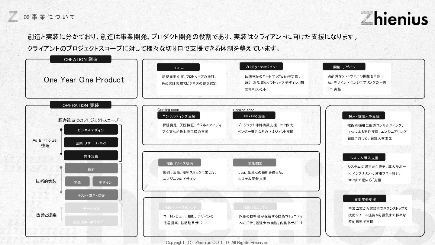 つ い て CREATION 創造 One Year One Product ビジネスデザイン 企画・リサーチ・PoC 要件定義 設計 デザイン 開発 テスト・運用・保守 データ分析 顧客視点でのプロジェクトスコープ 改善提案・実行サポート As Is→To Be 整理 技術的実装 改善と提案 技術リソース提供 経験、言語、技術スタックに応じた、 エンジニアのアサイン 受託開発 LLM、生成AIの技術を使った、 システム開発支援 コンサルティング支援 課題発見、仮説検証、ビジネスアイディ ア立案など最上流工程の支援 PM・PMO支援 プロジェクト体制構築支援、RFP作成 ベンダー選定などのマネジメント支援 技術イネーブルメント コードレビュー、技術、デザインの 改善提案、技術助言サポート 技術コミュニティ 外部の技術者が在籍する技術コミュニティ への招待、勉強会の実施。内製化サポート 採用・組織人事支援 技術者採用全般のコンサルティング、 RPOによる実行支援、エンジニアリング 組織における、組織人材開発 システム導入支援 システム の選定から販売、導入サポー ト、インプリメント、運用フロー設計、 BPOまで幅広くご支援 BizDev 新規事業立案、プロトタイプの検証、 PoC実証実験でビジネスの筋を選定 プロダクトマネジメント 仮説検証のロードマップとMVP定義、 速く、高品質なソフトウェアデザイン、開 発マネジメント 開発・デザイン 高品質なソフトウェアの開発を目指し た、デザイン×エンジニアリングの一貫 した実装 事業開発支援 事業立案から実装までをワンストップで 技術リソース提供から請負まで様々な 契約形態で支援 OPERATION 実装 創造と実装に分かており、創造は事業開発、プロダクト開発の役割であり、実装はクライアントに向けた支援になります。 クライアントのプロジェクトスコープに対して様々な切り口で支援できる体制を整えています。 Coming soon Coming soon