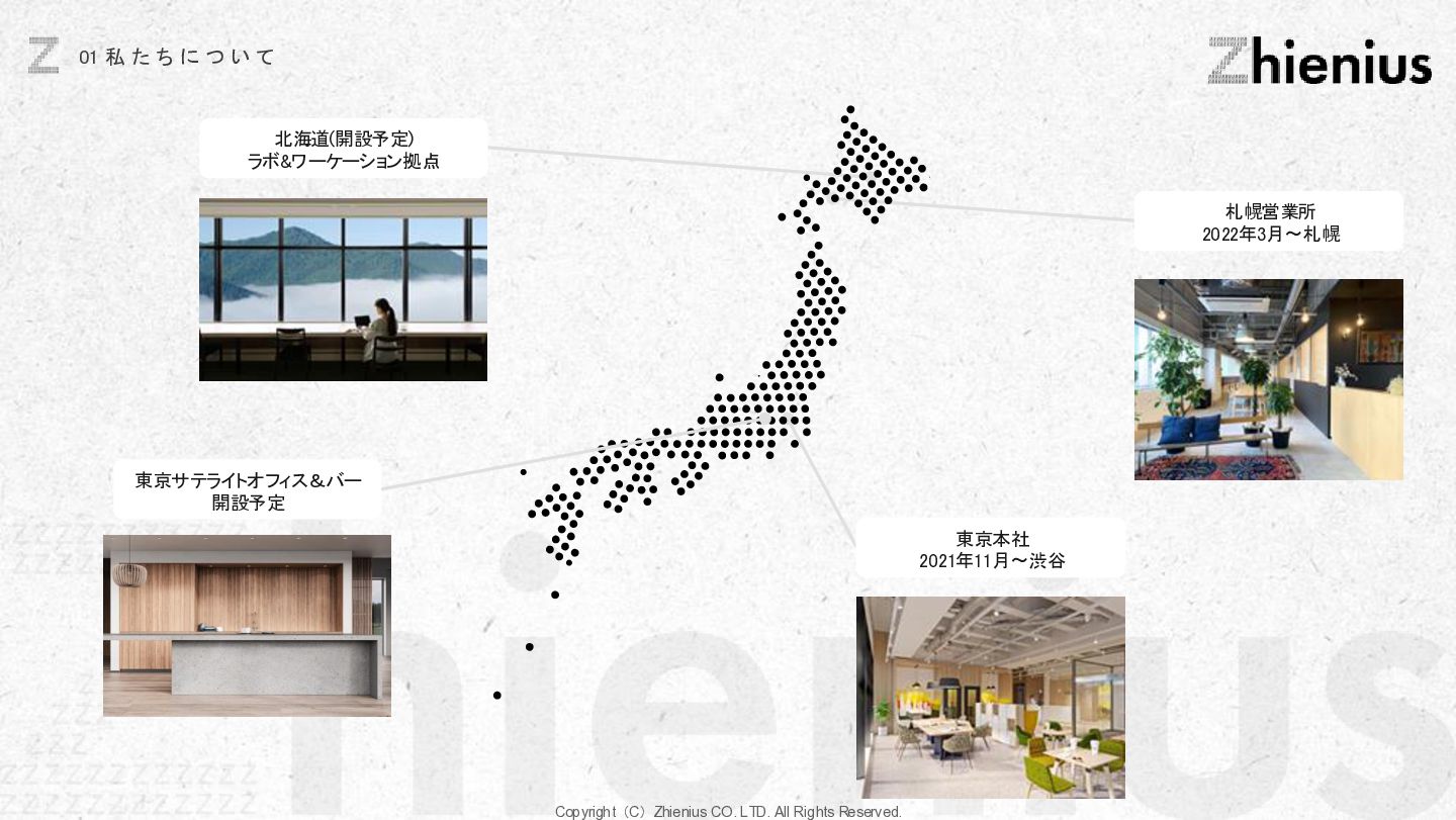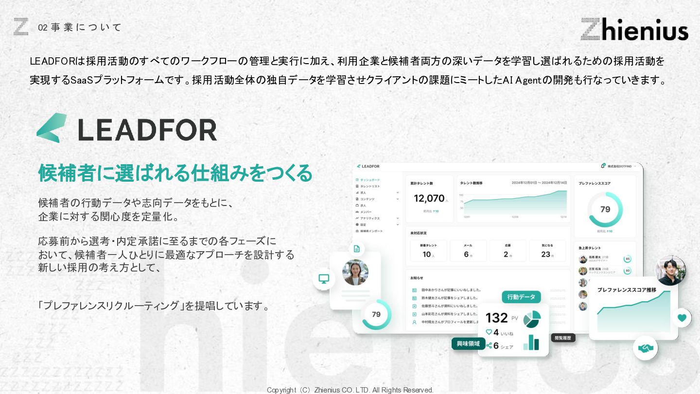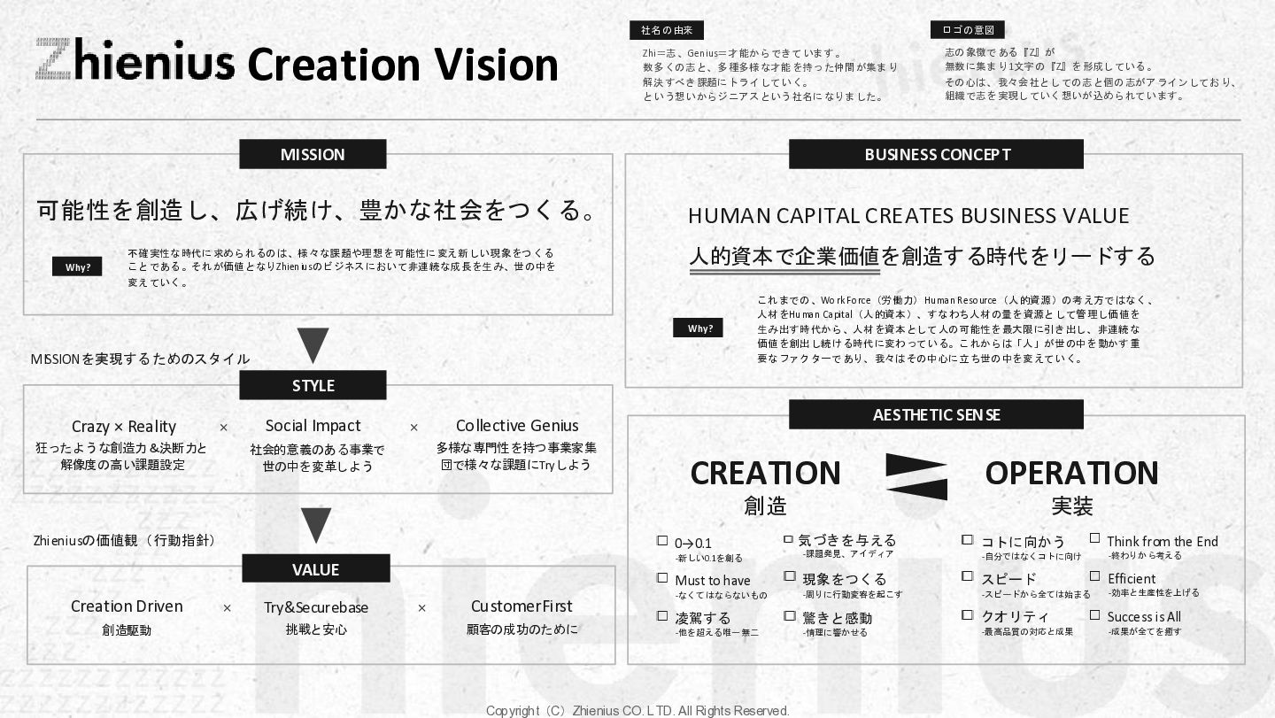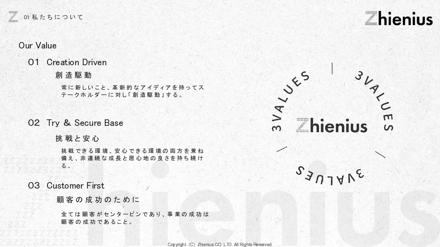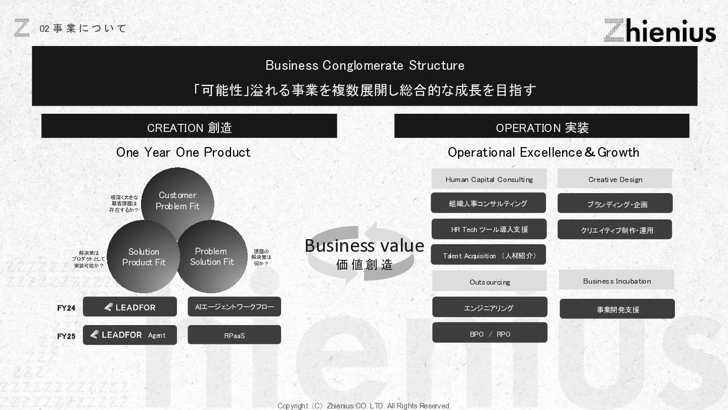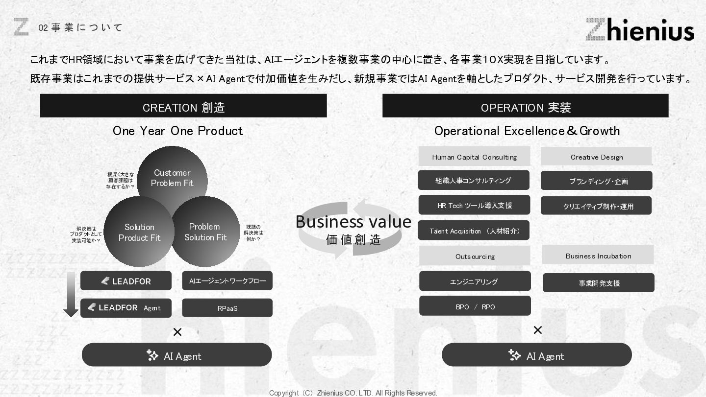 つ い て CREATION 創造 One Year One Product ビジネスデザイン 企画・リサーチ・PoC 要件定義 設計 デザイン 開発 テスト・運用・保守 データ分析 顧客視点でのプロジェクトスコープ 改善提案・実行サポート As Is→To Be 整理 技術的実装 改善と提案 技術リソース提供 経験、言語、技術スタックに応じた、 エンジニアのアサイン 受託開発 LLM、生成AIの技術を使った、 システム開発支援 コンサルティング支援 課題発見、仮説検証、ビジネスアイディ ア立案など最上流工程の支援 PM・PMO支援 プロジェクト体制構築支援、RFP作成 ベンダー選定などのマネジメント支援 技術イネーブルメント コードレビュー、技術、デザインの 改善提案、技術助言サポート 技術コミュニティ 外部の技術者が在籍する技術コミュニティ への招待、勉強会の実施。内製化サポート 採用・組織人事支援 技術者採用全般のコンサルティング、 RPOによる実行支援、エンジニアリング 組織における、組織人材開発 システム導入支援 システム の選定から販売、導入サポー ト、インプリメント、運用フロー設計、 BPOまで幅広くご支援 BizDev 新規事業立案、プロトタイプの検証、 PoC実証実験でビジネスの筋を選定 プロダクトマネジメント 仮説検証のロードマップとMVP定義、 速く、高品質なソフトウェアデザイン、開 発マネジメント 開発・デザイン 高品質なソフトウェアの開発を目指し た、デザイン×エンジニアリングの一貫 した実装 事業開発支援 事業立案から実装までをワンストップで 技術リソース提供から請負まで様々な 契約形態で支援 OPERATION 実装 創造と実装に分かており、創造は事業開発、プロダクト開発の役割であり、実装はクライアントに向けた支援になります。 クライアントのプロジェクトスコープに対して様々な切り口で支援できる体制を整えています。 Coming soon Coming soon