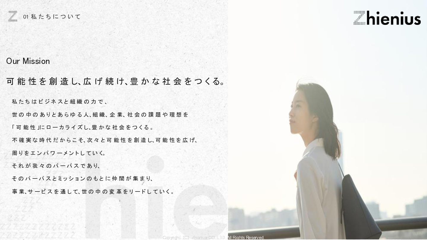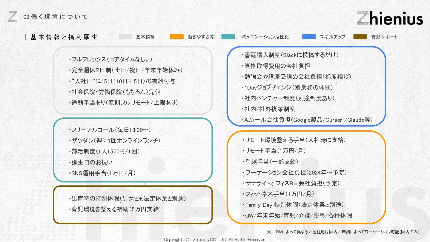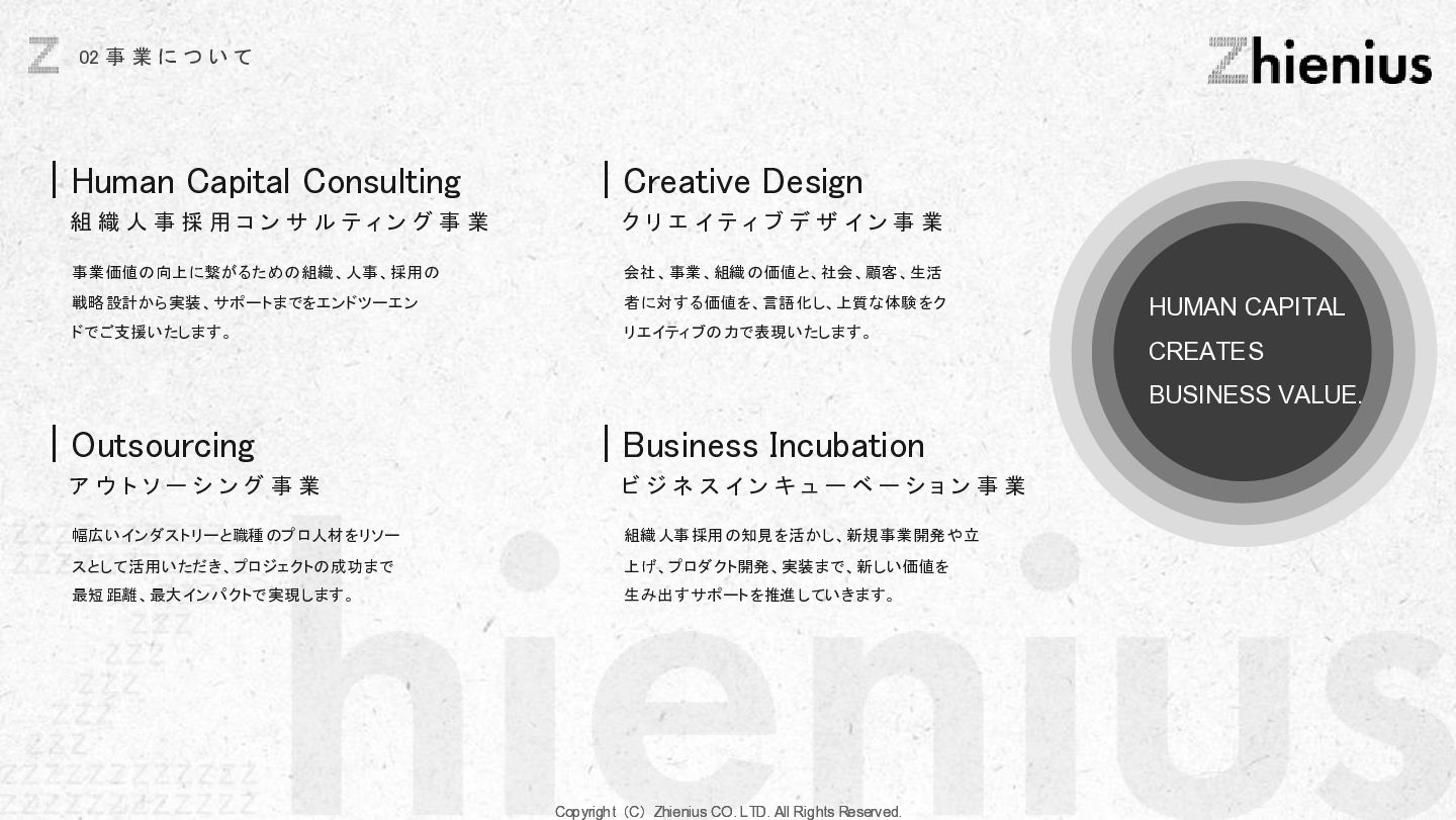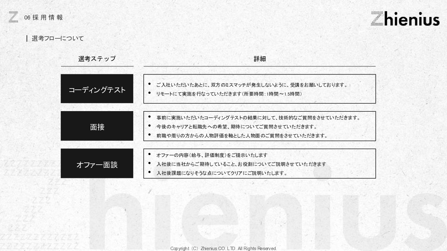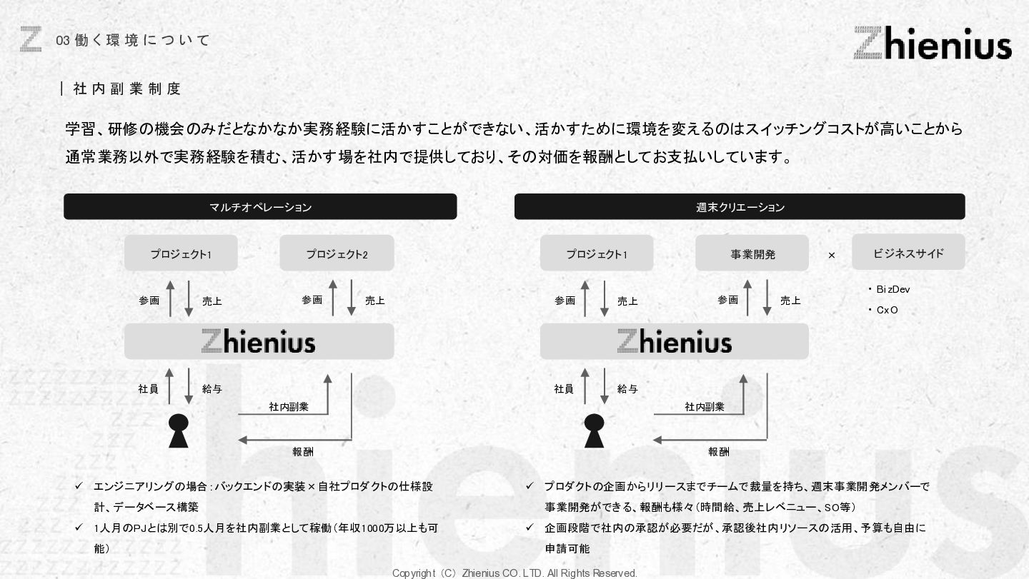 つ い て CREATION 創造 One Year One Product ビジネスデザイン 企画・リサーチ・PoC 要件定義 設計 デザイン 開発 テスト・運用・保守 データ分析 顧客視点でのプロジェクトスコープ 改善提案・実行サポート As Is→To Be 整理 技術的実装 改善と提案 技術リソース提供 経験、言語、技術スタックに応じた、 エンジニアのアサイン 受託開発 LLM、生成AIの技術を使った、 システム開発支援 コンサルティング支援 課題発見、仮説検証、ビジネスアイディ ア立案など最上流工程の支援 PM・PMO支援 プロジェクト体制構築支援、RFP作成 ベンダー選定などのマネジメント支援 技術イネーブルメント コードレビュー、技術、デザインの 改善提案、技術助言サポート 技術コミュニティ 外部の技術者が在籍する技術コミュニティ への招待、勉強会の実施。内製化サポート 採用・組織人事支援 技術者採用全般のコンサルティング、 RPOによる実行支援、エンジニアリング 組織における、組織人材開発 システム導入支援 システム の選定から販売、導入サポー ト、インプリメント、運用フロー設計、 BPOまで幅広くご支援 BizDev 新規事業立案、プロトタイプの検証、 PoC実証実験でビジネスの筋を選定 プロダクトマネジメント 仮説検証のロードマップとMVP定義、 速く、高品質なソフトウェアデザイン、開 発マネジメント 開発・デザイン 高品質なソフトウェアの開発を目指し た、デザイン×エンジニアリングの一貫 した実装 事業開発支援 事業立案から実装までをワンストップで 技術リソース提供から請負まで様々な 契約形態で支援 OPERATION 実装 創造と実装に分かており、創造は事業開発、プロダクト開発の役割であり、実装はクライアントに向けた支援になります。 クライアントのプロジェクトスコープに対して様々な切り口で支援できる体制を整えています。 Coming soon Coming soon