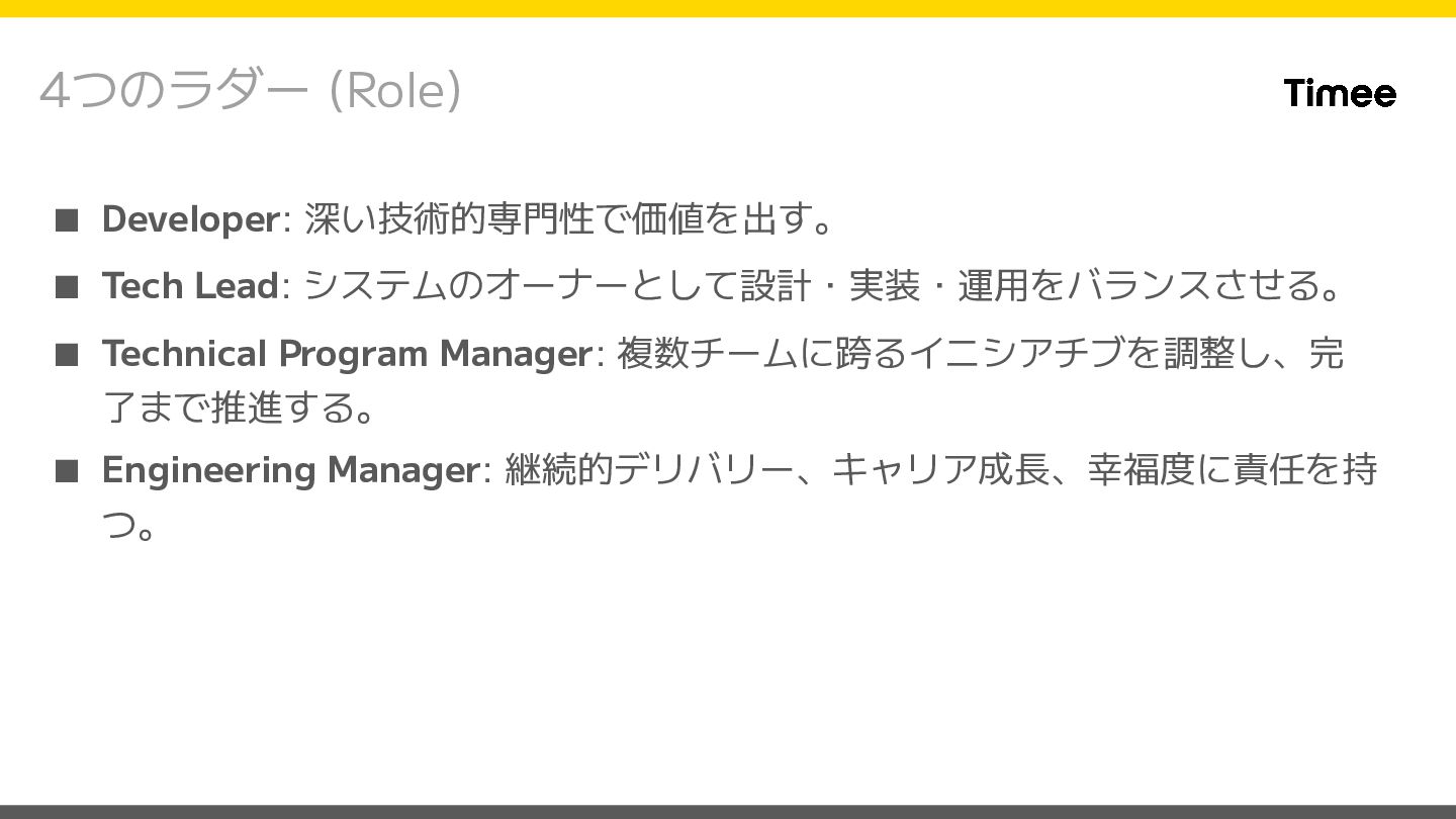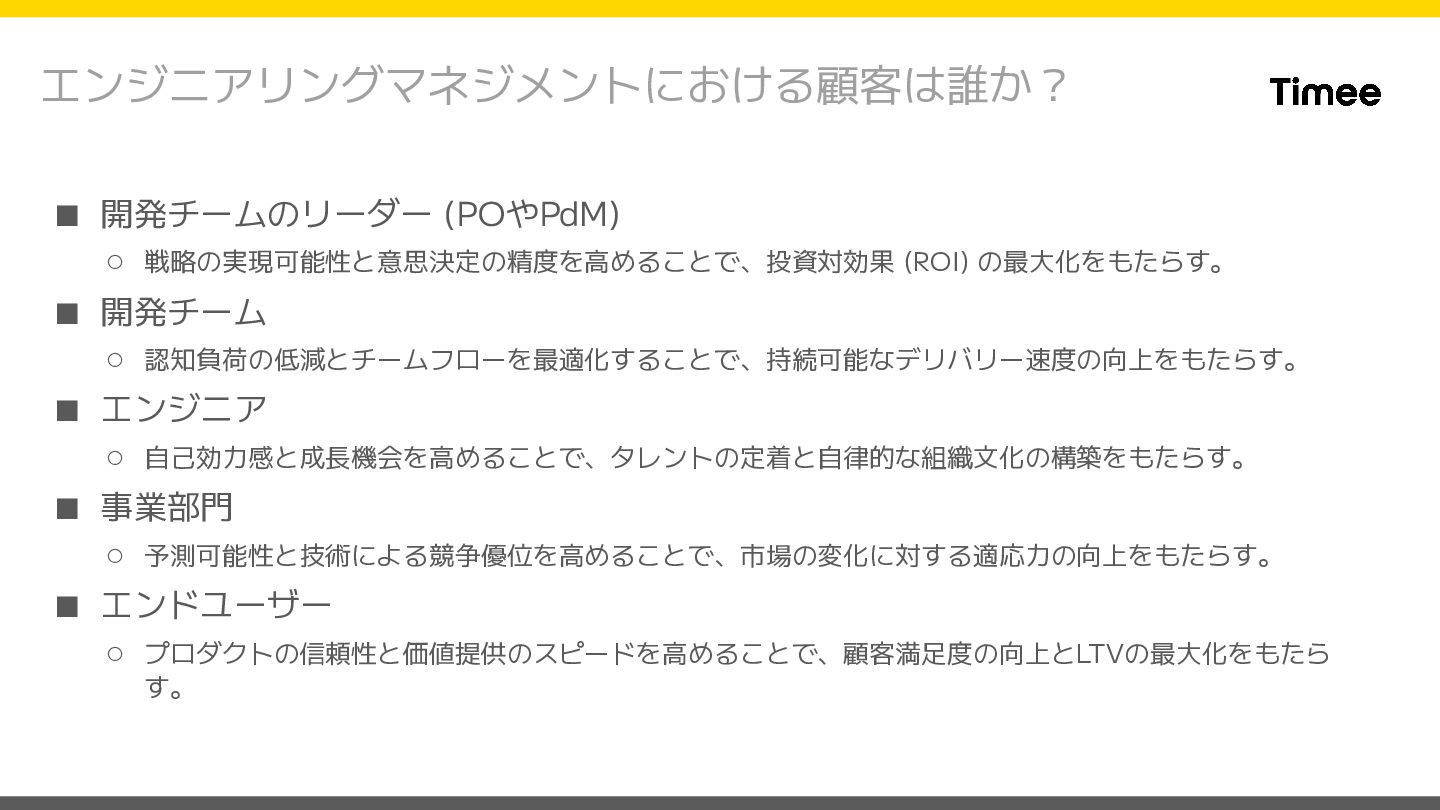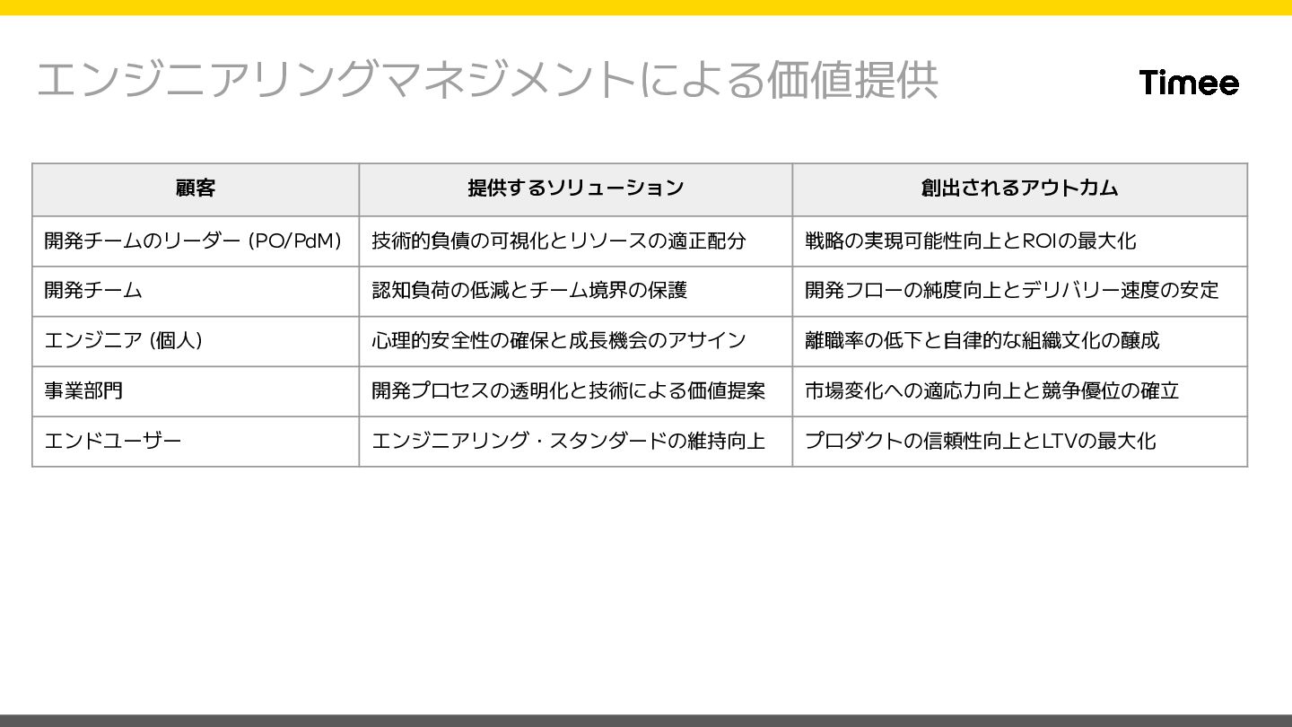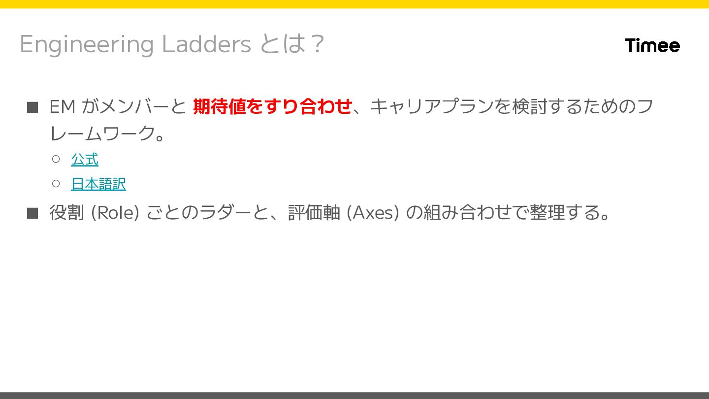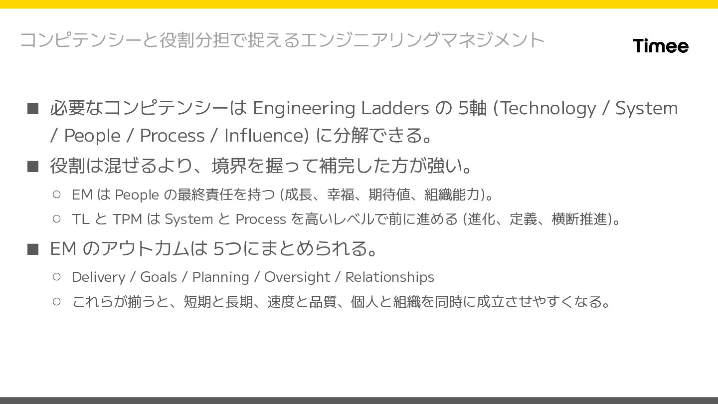 具体的には、Engineering Ladders のコンピテンシーフレームワークを用いて、各レベルで求められるケイパビリティ、能力発揮の方向性、そしてレベルデザインを詳細に解説します。Intermediate EM から VP クラスへの成長には、技術的な深さだけでなく、ビジネス理解、組織横断的な影響力、そして経営視点での判断力が不可欠です。