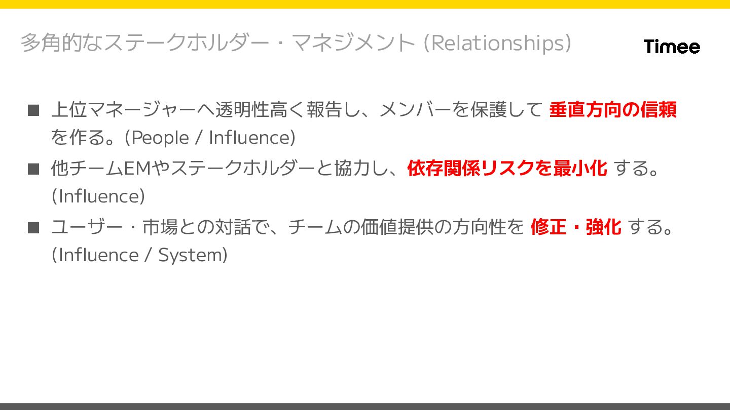 トップマネジメントが求めるのは、単なるチーム運営ではなく、組織全体への戦略的貢献です。Intermediate EM と VP クラスでは、影響範囲、意思決定の質、そして組織への影響力において決定的な差があります。