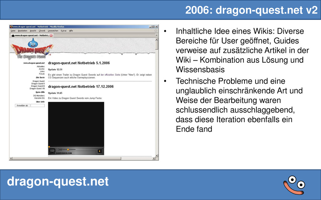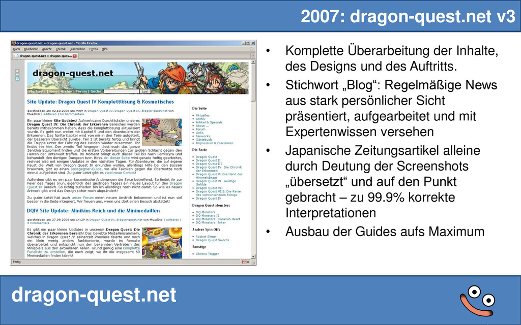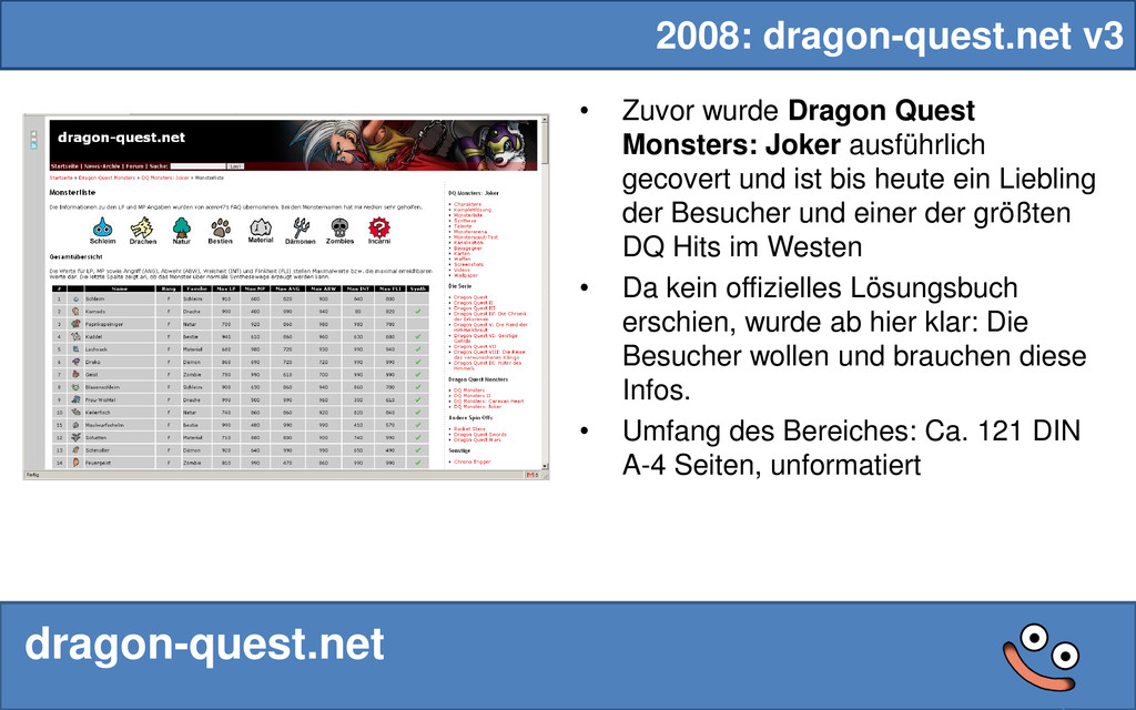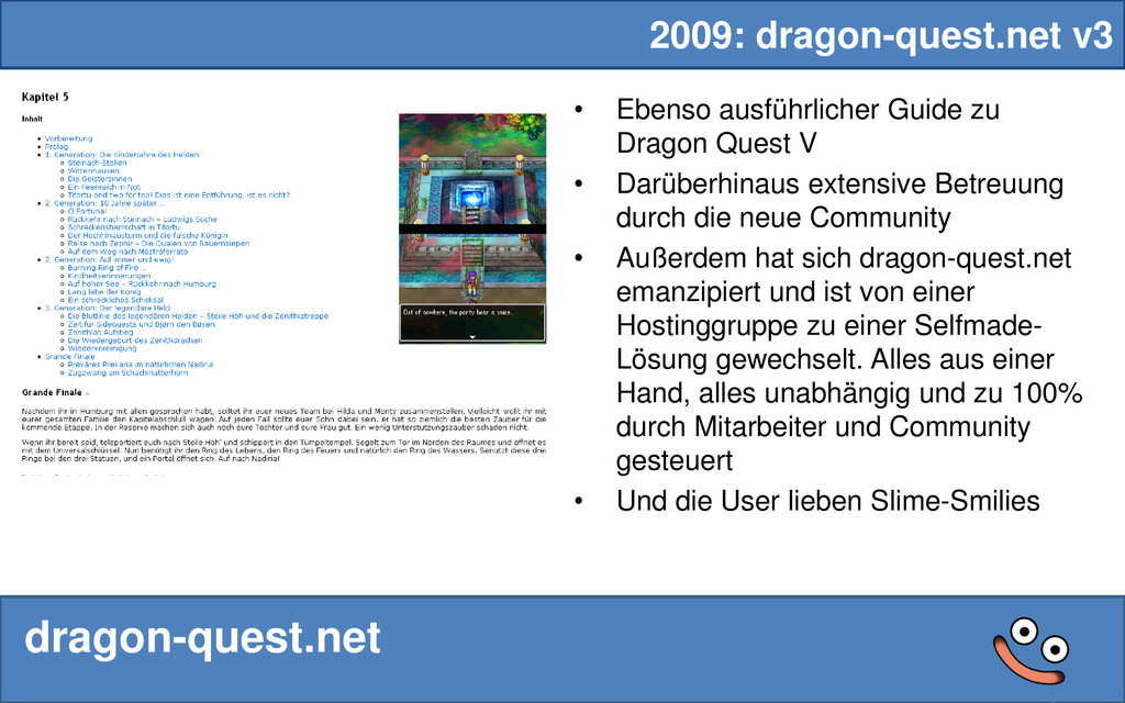 Quest V • Darüberhinaus extensive Betreuung durch die neue Community • Außerdem hat sich dragon-quest.net emanzipiert und ist von einer Hostinggruppe zu einer Selfmade- Lösung gewechselt. Alles aus einer Hand, alles unabhängig und zu 100% durch Mitarbeiter und Community gesteuert • Und die User lieben Slime-Smilies