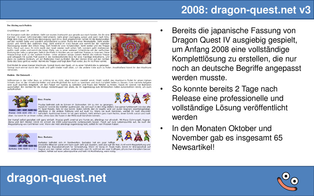 Dragon Quest IV ausgiebig gespielt, um Anfang 2008 eine vollständige Komplettlösung zu erstellen, die nur noch an deutsche Begriffe angepasst werden musste. • So konnte bereits 2 Tage nach Release eine professionelle und vollständige Lösung veröffentlicht werden • In den Monaten Oktober und November gab es insgesamt 65 Newsartikel!