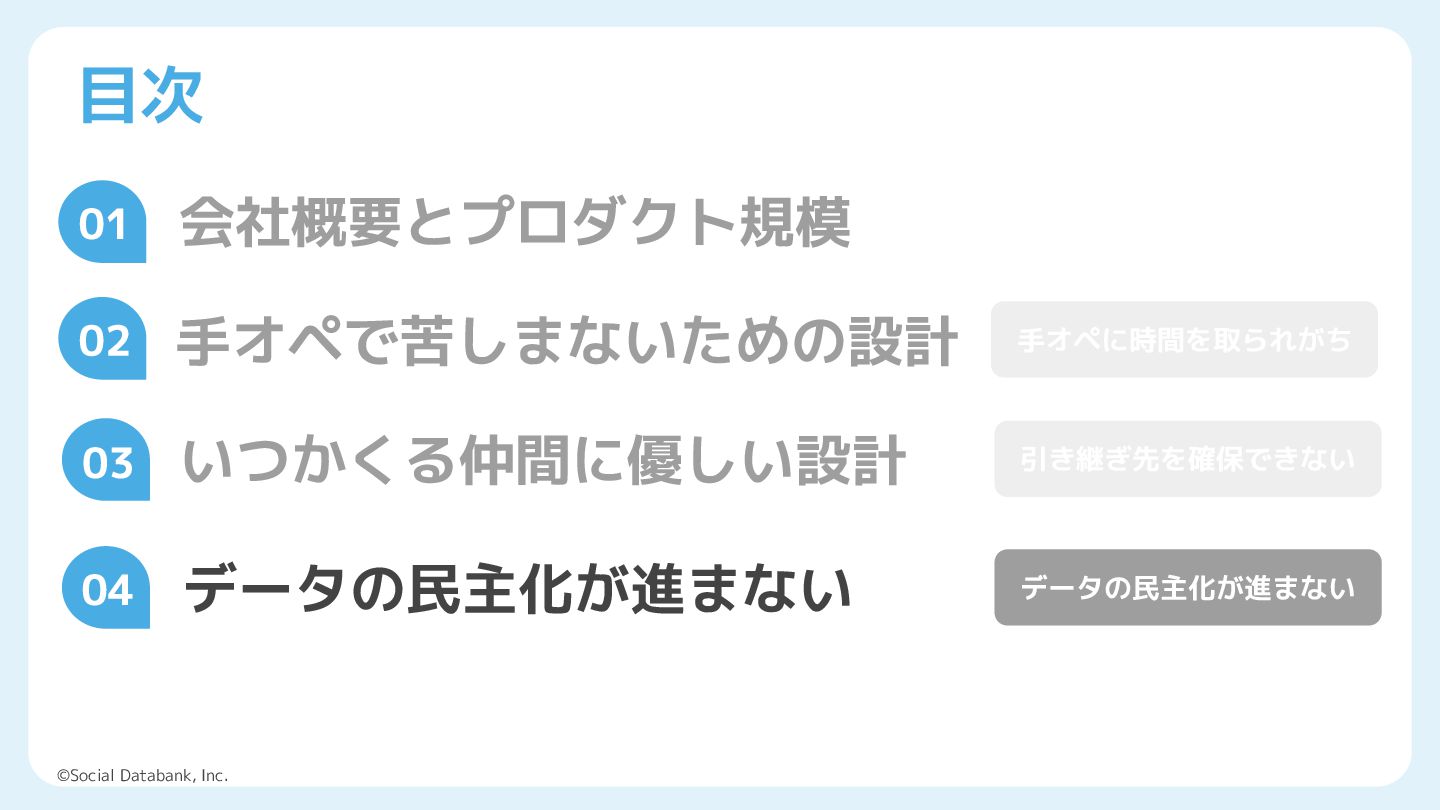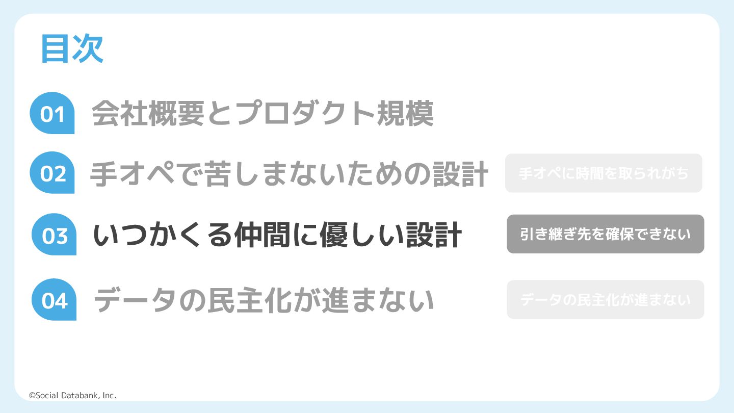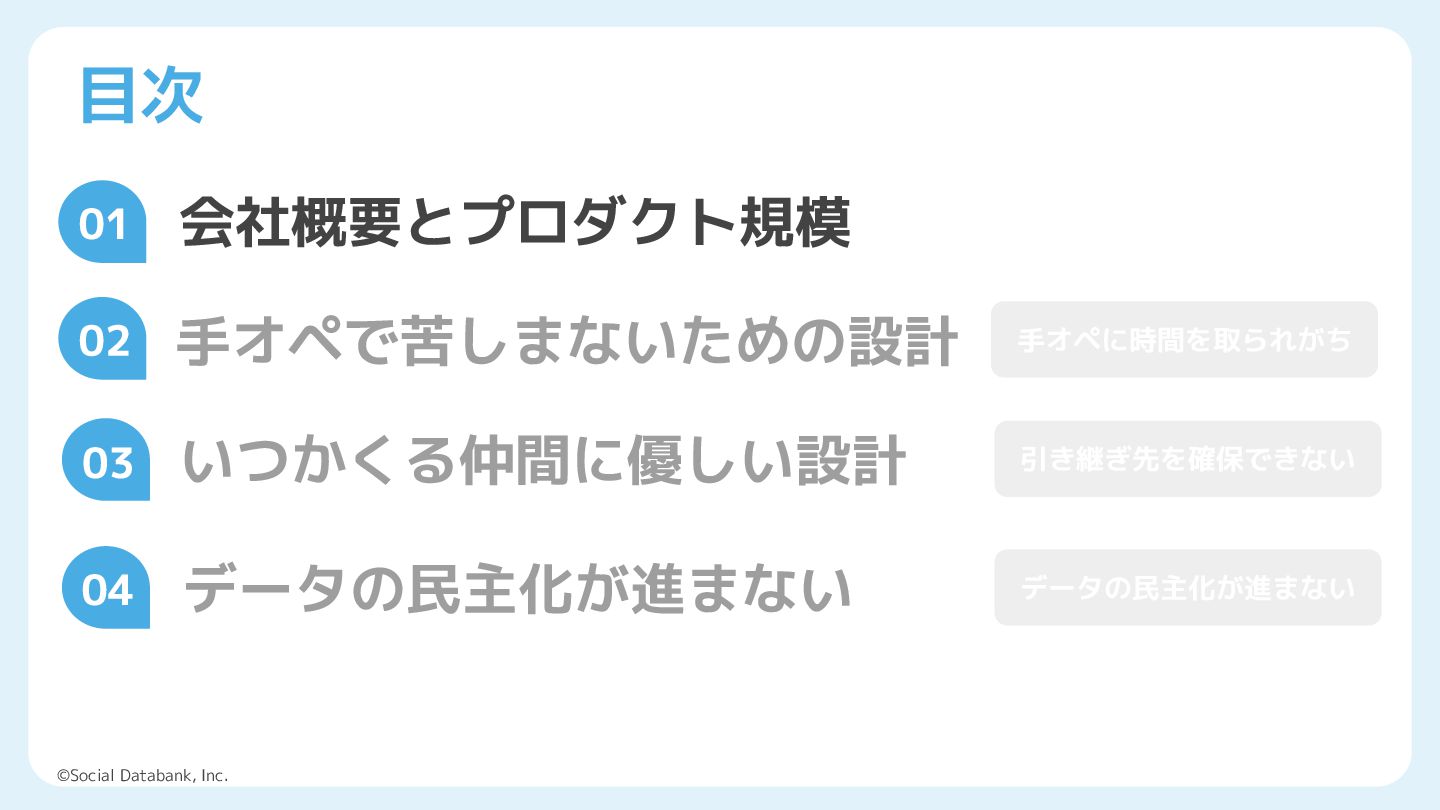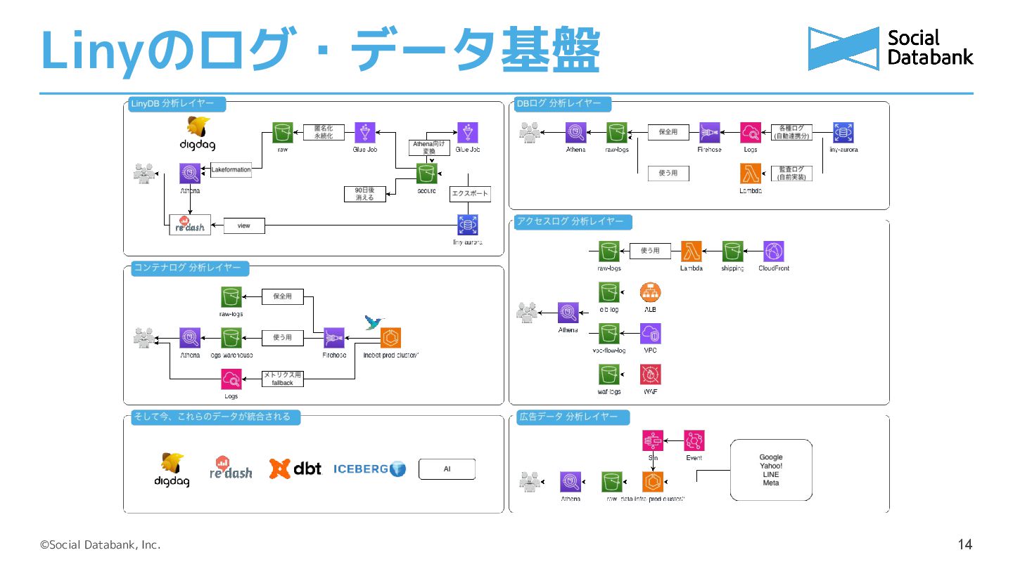 「データドリブン」が当たり前になった現代。クラウドやSaaSが日々進化していますが、データ基盤開発にはまだまだ泥臭い作業がつきものです。データエンジニアが1人しかいない、SREが兼業でやっている──そんなリソース不足の現場でどのようにデータ活用を推進するのか。本セッションでは、弊社サービス「Liny」で構築したログ・データ基盤について失敗談や今後の展望を添えてお話しいたします。