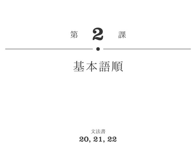 まず動詞の直後に主語 (a 句) が置かれ、 その後に各種の目的語 (e 句や ca 句) が来て、 さらにそれ以 外の助詞句が続くという順番で並べると考えてください。 また、 日本語では主語がよく省略されますが、 シャレイア語で は a 句を省略すると意味が変わってしまう場合があります。 基本的に a 句は省略しないと考えてください。 feges a ces e xoq afik . 主語 目的語