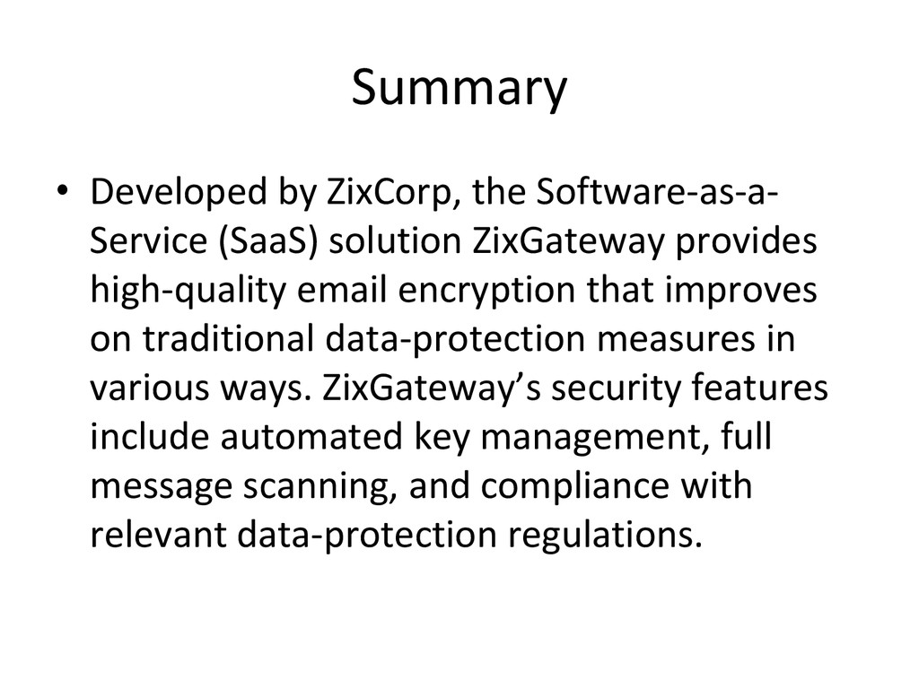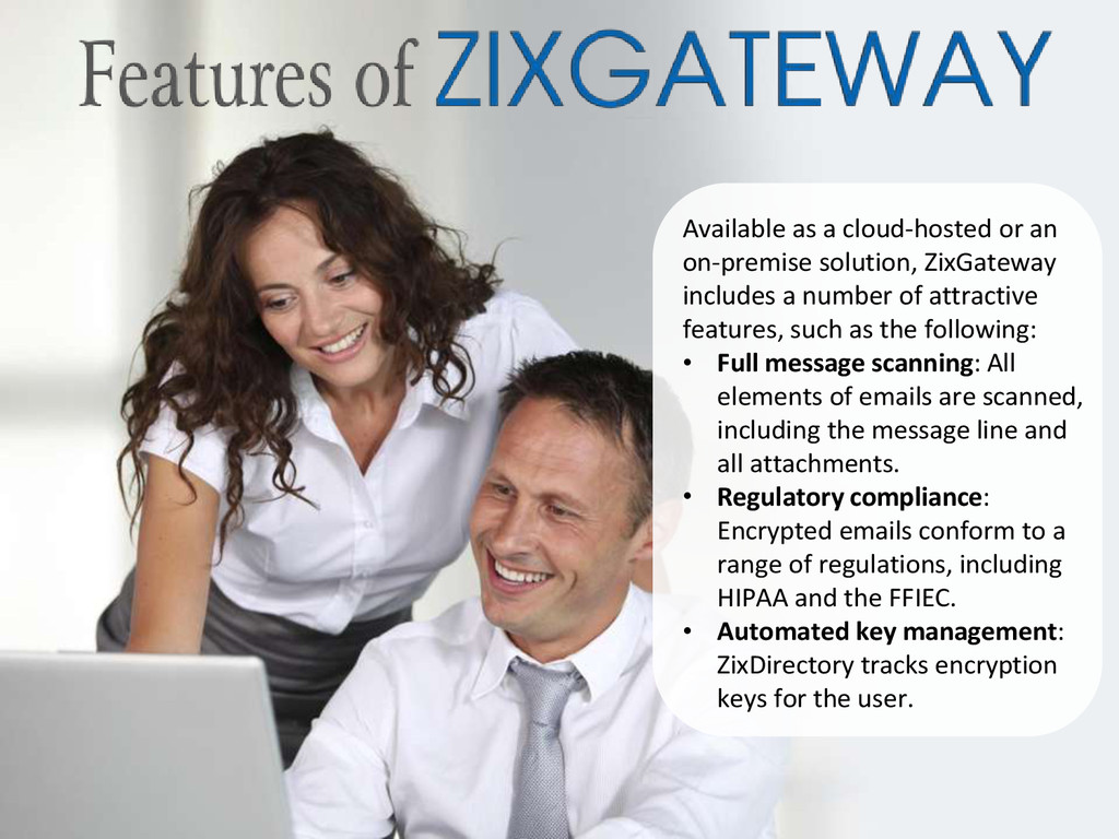 http://www.zixemailsecurity.com/ | In today’s business world, email has earned a secure position as the favored communication medium, as its ability to facilitate quick, convenient communication has yet to be surpassed. Unfortunately, email is vulnerable to security breaches that may expose sensitive information. To combat this problem, ZixCorp has developed ZixGateway, an email encryption solution with a number of useful data-protection features.