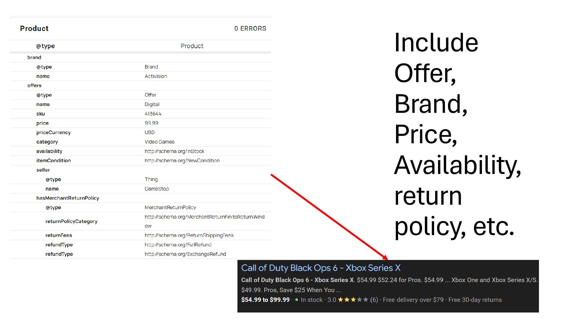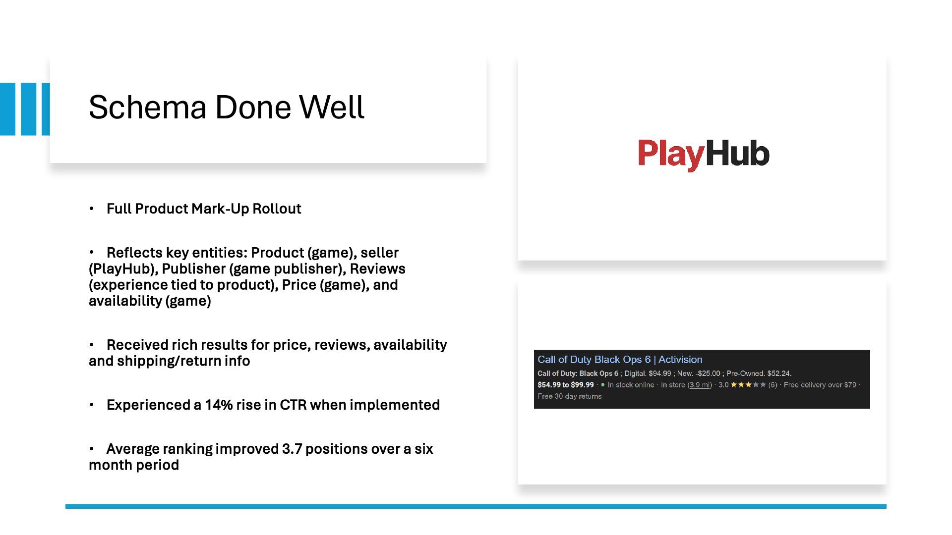 key entities: Product (game), seller (PlayHub), Publisher (game publisher), Reviews (experience tied to product), Price (game), and availability (game) • Received rich results for price, reviews, availability and shipping/return info • Experienced a 14% rise in CTR when implemented • Average ranking improved 3.7 positions over a six month period