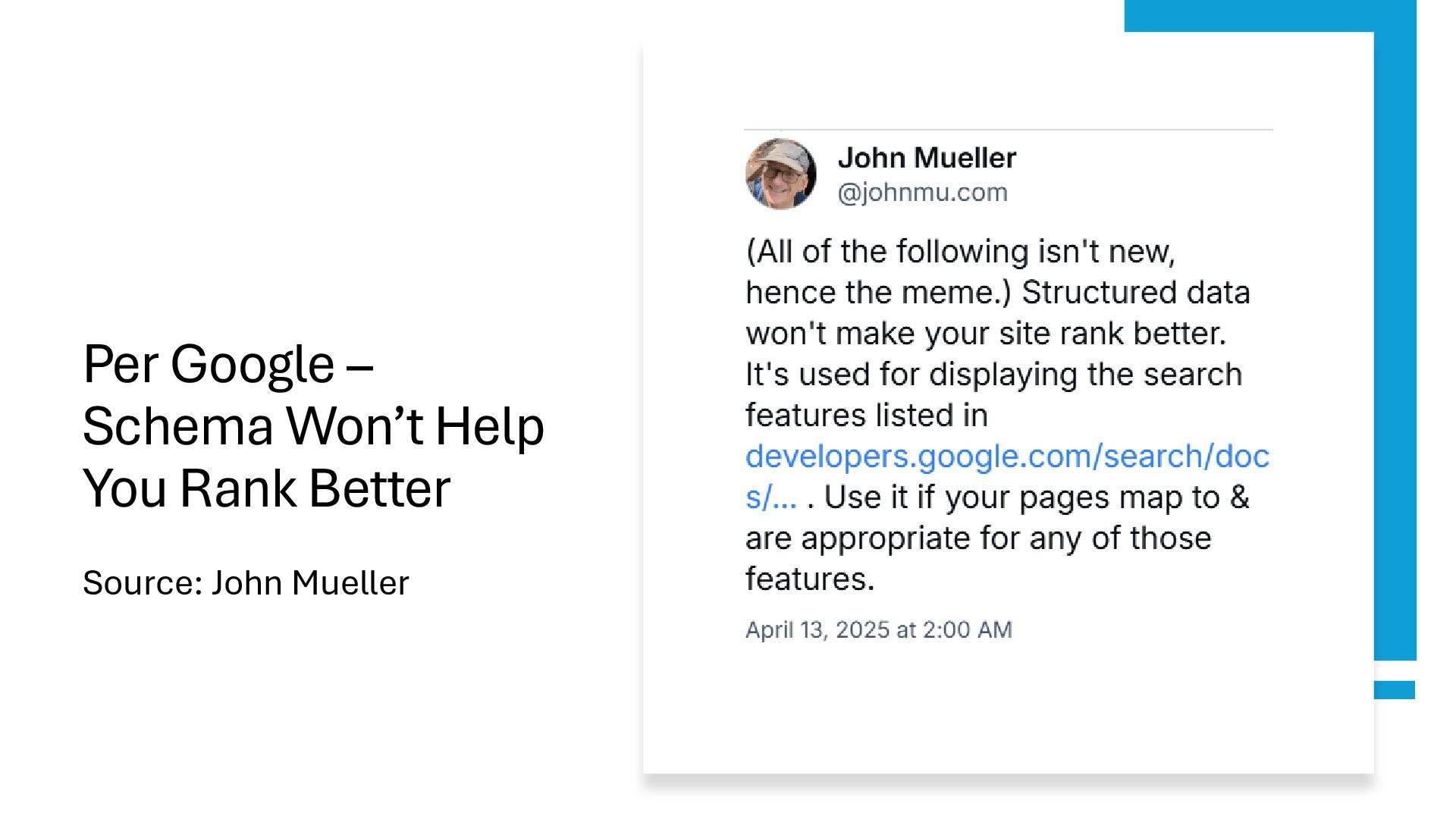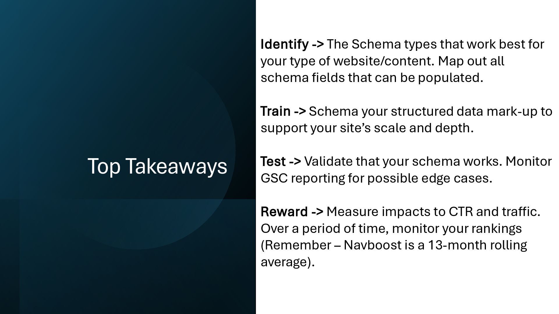 for your type of website/content. Map out all schema fields that can be populated. Train -> Schema your structured data mark-up to support your site’s scale and depth. Test -> Validate that your schema works. Monitor GSC reporting for possible edge cases. Reward -> Measure impacts to CTR and traffic. Over a period of time, monitor your rankings (Remember – Navboost is a 13-month rolling average).