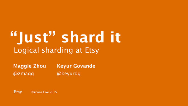 In this talk, we'll go over the pains and perils of sharding databases and how we solved some of the problems in Etsy's second take on sharding, what we call logical sharding. Logical sharding is where we put several databases on one mysqld, as opposed to one database per server. Upon hitting a resource limit on a box (CPU, Memory, Connections, etc) that would normally require individual row migration, we can instead do file level migrations of a database, replicate, then drop previous databases, which is super fast and a cleaner way to delete old unnecessary shard data. We'll also go over how logical sharding benefits other daily operational challenges like schema changes and backups, as well as makes life easier for our downstream analytics consumers.