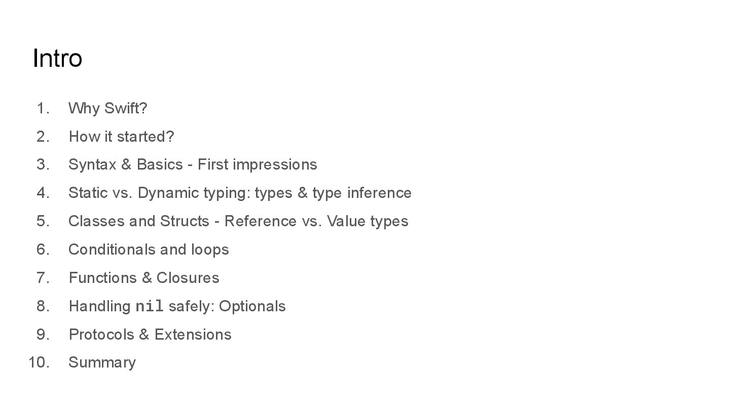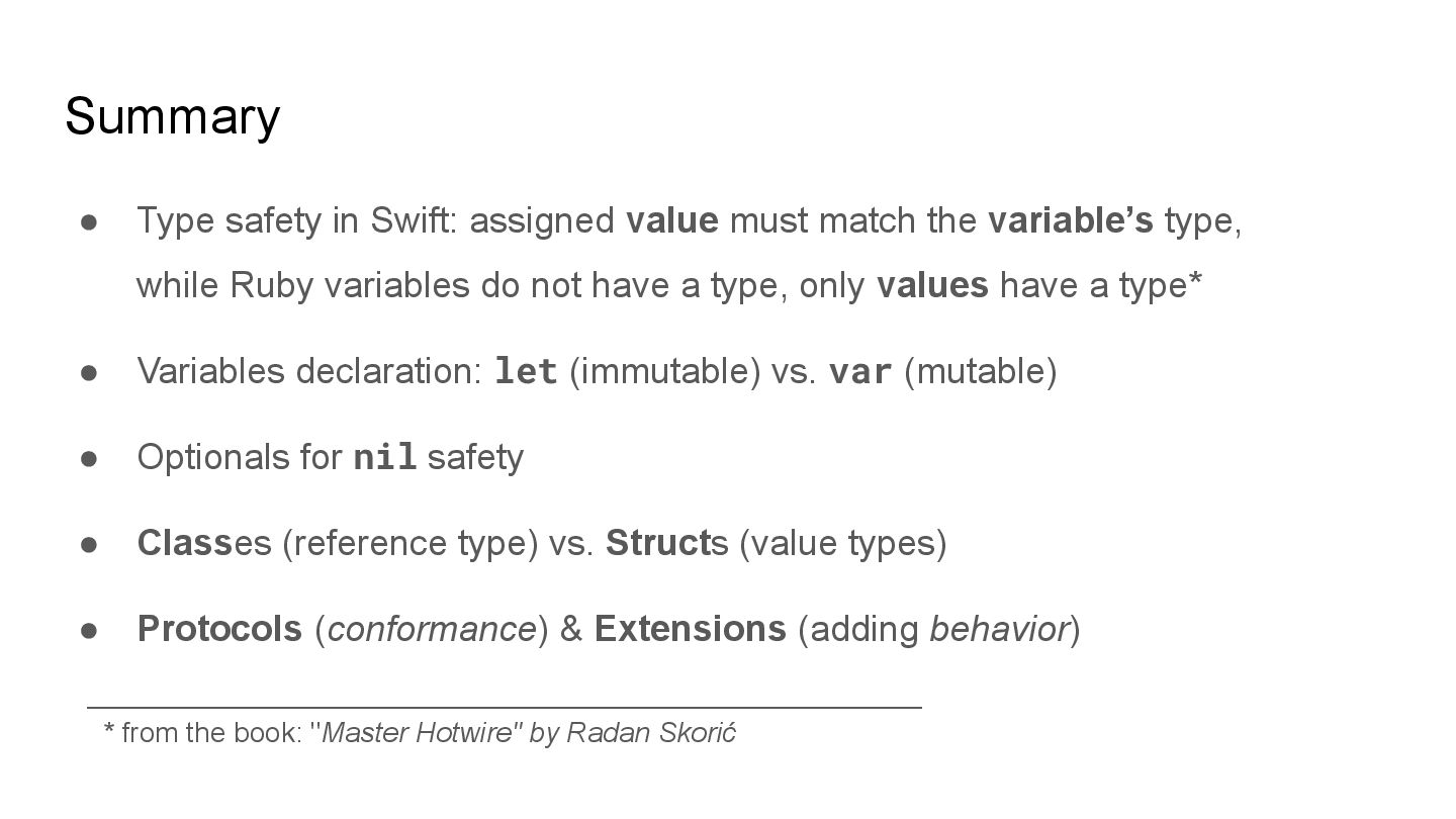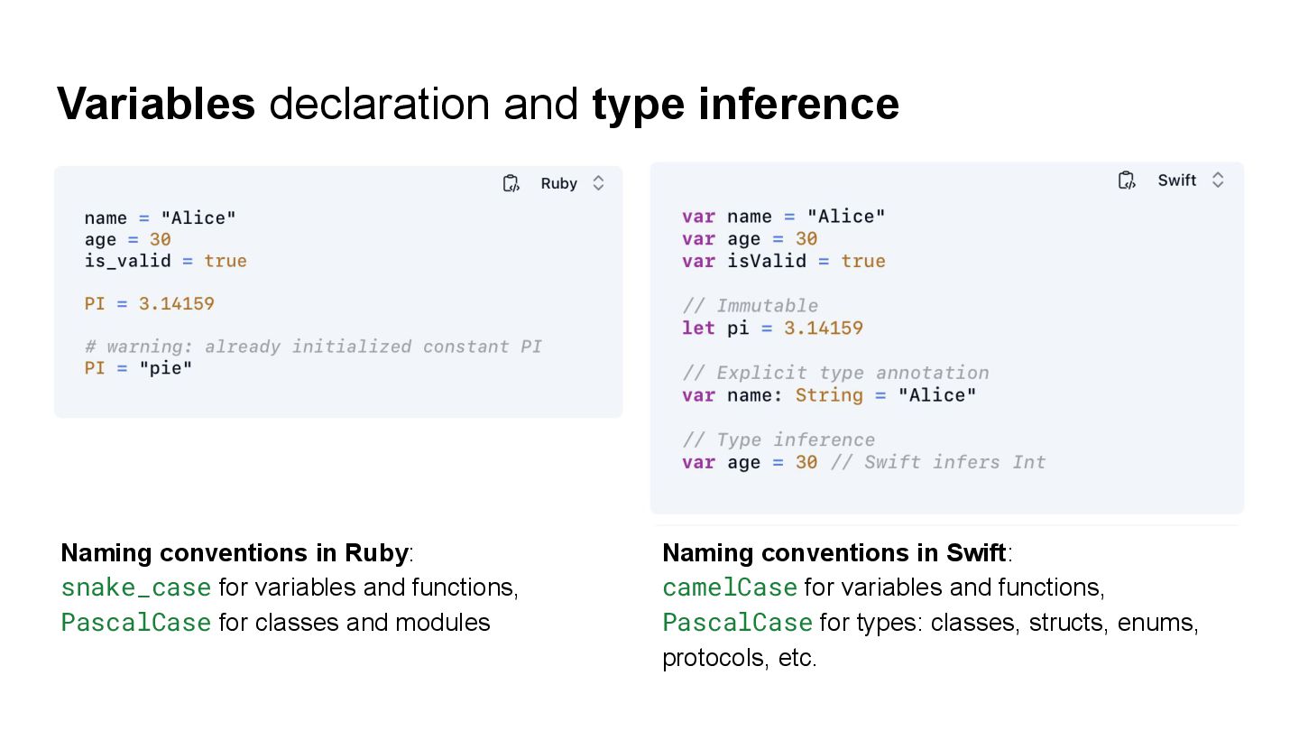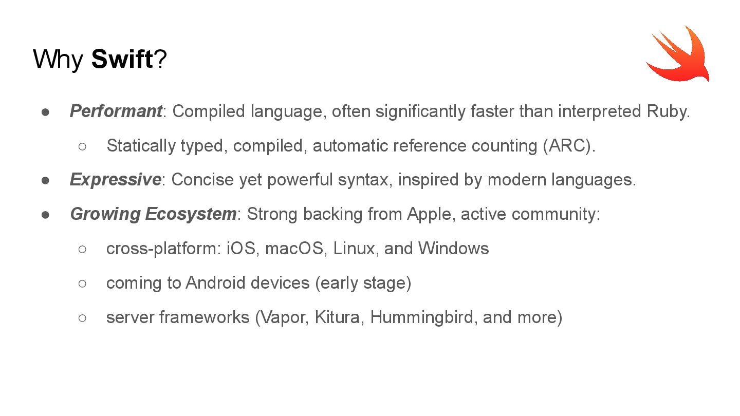 interpreted Ruby. ◦ Statically typed, compiled, automatic reference counting (ARC). • Expressive: Concise yet powerful syntax, inspired by modern languages. • Growing Ecosystem: Strong backing from Apple, active community: ◦ cross-platform: iOS, macOS, Linux, and Windows ◦ coming to Android devices (early stage) ◦ server frameworks (Vapor, Kitura, Hummingbird, and more)