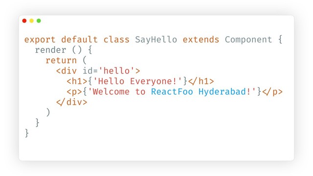 return ( <div id='hello'> <h1>{'Hello Everyone!'} </h1> <p>{'Welcome to ReactFoo Hyderabad!’} </p> </div> ) } }