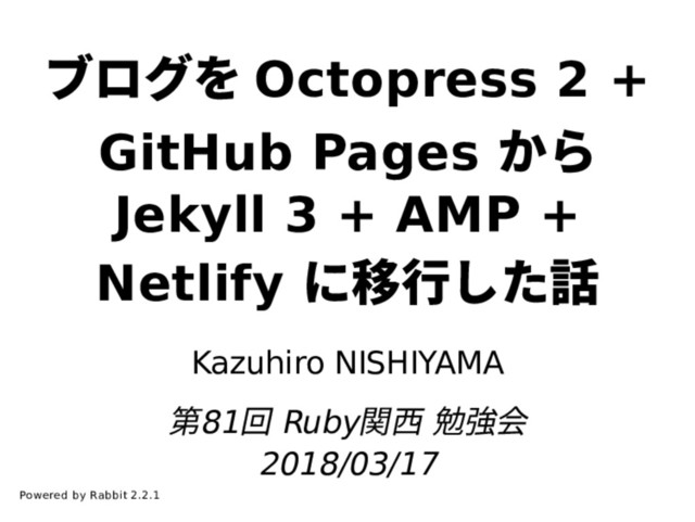 AMP + Netlify に移⾏した話 Kazuhiro NISHIYAMA 第81回 Ruby関⻄ 勉強会 2018/03/17 Powered by Rabbit 2.2.1