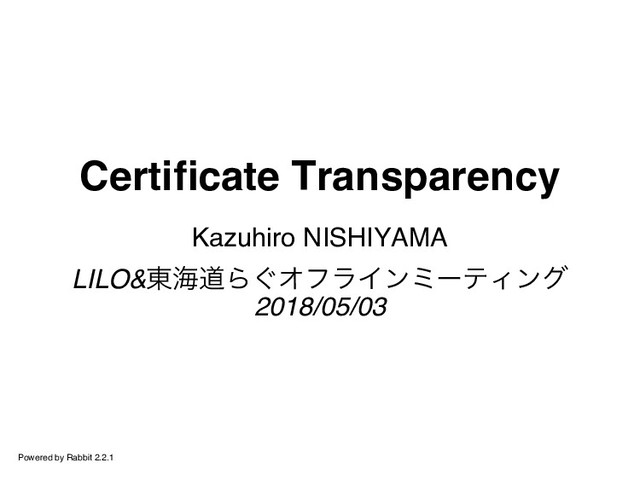 Certifcate Transparency Kazuhiro NISHIYAMA LILO&東海道らぐオフラインミーティング 2018/05/03 Powered by Rabbit 2.2.1