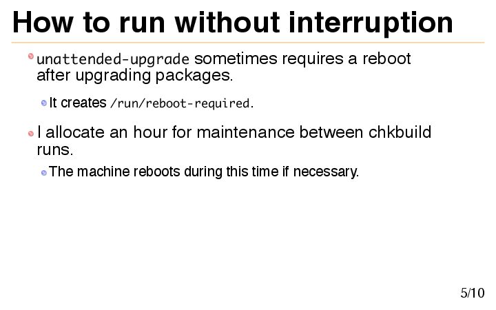 after upgrading packages. It creates /run/reboot-required. I allocate an hour for maintenance between chkbuild runs. The machine reboots during this time if necessary. 5/10