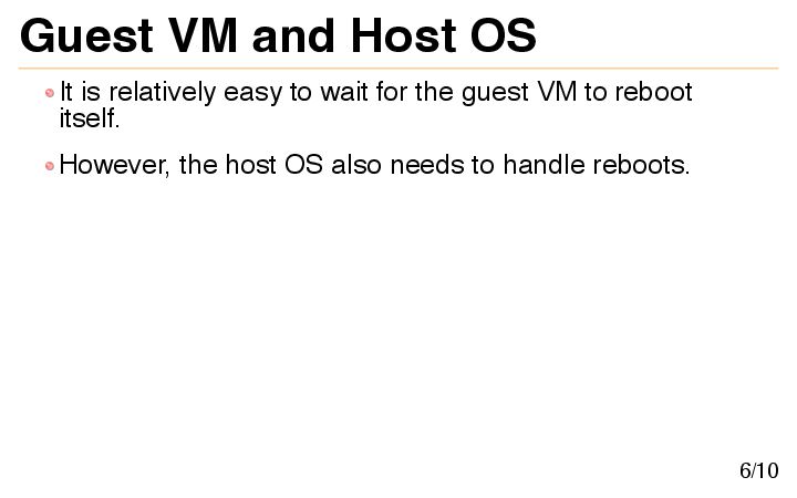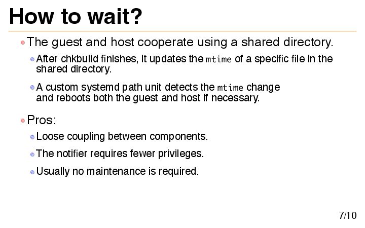 shared directory. After chkbuild finishes, it updates the mtime of a specific file in the shared directory. A custom systemd path unit detects the mtime change and reboots both the guest and host if necessary. Pros: Loose coupling between components. The notifier requires fewer privileges. Usually no maintenance is required. 7/10