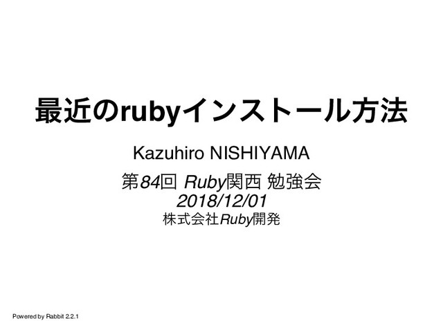 最近のrubyインストール方法 Kazuhiro NISHIYAMA 第84回 Ruby関西 勉強会 2018/12/01 株式会社Ruby開発 Powered by