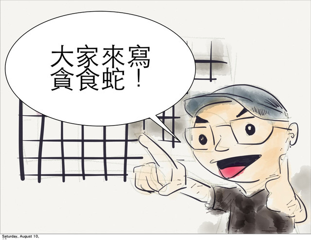 ⼤大家來寫 貪⻝⾷食蛇! Saturday, August 10,