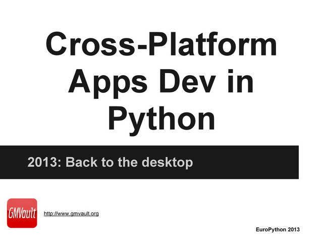 With the emergence of mobile platforms such as IOS and Android, building Applications (Apps) has again been trendy for the last three to five years within the developers’ community. The birth of Apps stores for traditional platforms such as Mac OS X, Windows 8 and Ubuntu also favors a re-birth of cross-plateform desktop applications development. Gmvault is a standalone open-source application allowing users to backup and restore their Gmail mailbox (www.gmvault.org). Within this talk, the Gmvault creator will detail based on his experience, why he thinks that the Python platform is a mature candidate to be used for developing cross-platform applications. He will detail the strengths of Python, to develop multi-platform applications in addition to its intrinsic qualities, like: the abstraction of Python OS oriented libraries (os, file) making Python agnostic of the hosting platform, the capacity to interface with any c/c++ library, the dedicated OS system APIs (win32, registry, …) to deal with OS specificities. He will also go through the current Python weaknesses when one wants to develop multi-platform applications like the complete lack of mature and well maintained desktop packaging and deployment libraries for Windows and Mac OS X, the limited number of available multi-platform GUI toolkits or the lack of libraries interfacing with the different OS scheduling or notification features. He will finally share his experience on building an open-source application and especially what the developer will get out of this journey if he is brave enough to embark on this adventure.