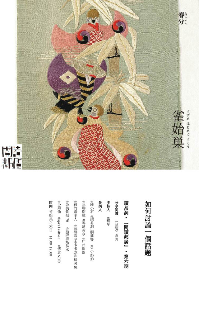 洞 · 『 閱 讀 鄰 居 』 · 第 六 期 分 享 閱 讀 《 話 題 》 系 列 主 持 人 @ 楊 早 參 與 人 @ 邱 小 石 @ 讀 易 洞 _ 洞 婆 婆 @3 少 奶 奶 @ 三 聯 衛 純 @ 啤 酒 黃 永 @ 广 州 圈 圈 @ 筱 竹 齋 主 人 @ 沉 醉 寒 冬 @ 卡 卡 龙 和 精 灵 兔 @ 袅 袅 炊 烟 79 @ 筋 牌 道 场 易 水 @ 小 菊 仙 @AprilisRosa @ 傅 蓉 SIUD 时 间 雀 始 巢 之 末 日 14:00-17:00
