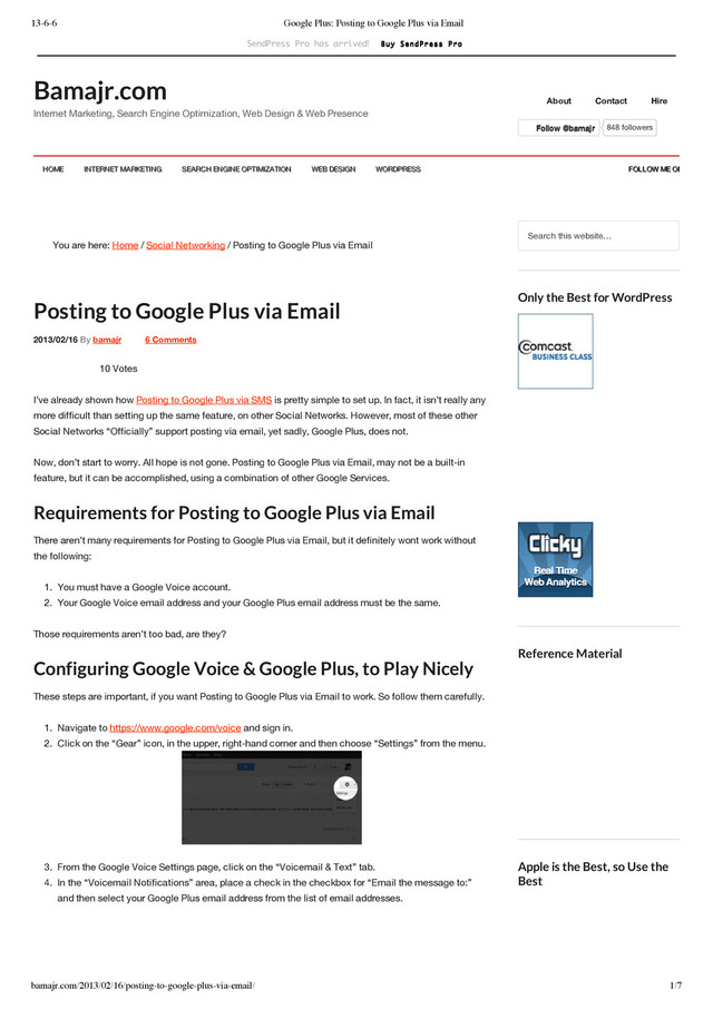 3/7 3 Like 6 Tweet Tweet 5 17. Click on the “Add Phone Number” link. Enter your Google Voice phone number and hit the “Send Verification Code” button. 18. Navigate back to your Google Voice account and retrieve the Verification Code. 19. Return to your Google Plus Profile Settings and enter the Verification Code. Done! If you followed these steps carefully, you will have successfully associated your Google Plus Profile with your Google Voice Phone Number. Now, Posting to Google Plus via Email is ready to use. Google Plus Email Composition Now that your accounts will allow Posting to Google Plus via Email, you need to know how to compose the email. 1. Create a new Email. 2. The “To Address” is where you will enter your unique email address, from Step 12, above. 3. The “Subject” is ignored and is not required by Google Plus. 4. Compose your Google Plus Post (email message), in the body of the email, followed by the circle or people you want your Google Plus Post to be shared with (+CircleName). If you want your post to be public, put “+Public” at the end of your email. If you want your post to be for a specific circle only, put “+YourCircleName” at the end of your email. 5. When you send this email, your message will be posted to your Google Plus Profile. Yes, I hear you. This is a pretty long process and can seem quite complicated. However, if you followed these steps, exactly as I have them written, you too, will be able to start Posting to Google Plus via Email. Automatically Post to Google Plus Google is working on an API to allow better integration and interaction with Google Plus. However, if you are like me, you don’t want to wait for the API to be “Officially” released, before being able to Automatically Post to Google Plus. I have great news! Once you have Posting to Google Plus via Email set up and working correctly, automatic posting to Google Plus, is also available. For more information on this, check out IFTTT, or stay tuned to this website. An article about this exact topic is coming soon. 2 Share Share Bamajr.com runs on Bamajr.com runs on The Genesis Framework The Genesis Framework The The Genesis Framework Genesis Framework empowers you to quickly and easily build incredible websites with empowers you to quickly and easily build incredible websites with WordPress. Whether you're a novice or advanced developer, Genesis provides you with the WordPress. Whether you're a novice or advanced developer, Genesis provides you with the secure and search-engine-optimized foundation that takes WordPress to places you never secure and search-engine-optimized foundation that takes WordPress to places you never thought it could go. thought it could go. With automatic theme updates and world-class support included, Genesis is the smart With automatic theme updates and world-class support included, Genesis is the smart choice for your WordPress website or blog. choice for your WordPress website or blog.