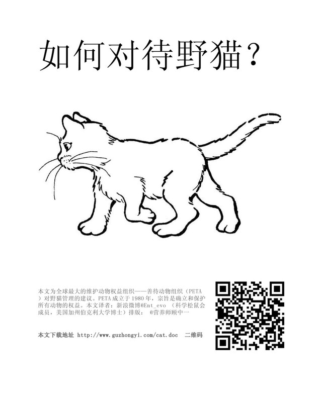 任何时候都应有干净的水供应,和喂食站之间保持一小段距离。有时如果水和食物太近,猫会拒 绝喝水。寒冷天气时,应把水放在阳光下以免结冰。 庇护所 如果猫群不是占据了废弃建筑或棚屋,那么他们需要一个有遮蔽的地方来躲避天气变化。建造一 个简单的棚屋,或者登报求购二手狗舍;这些狗舍可以很容易改造成猫窝,把入口改成猫的大小、 加上隔热材料就行了。庇护所必须防水,防风(寒冷地区),还要高出地面。使用稻草或者硬木 木屑来铺床(软木木屑有毒)。不要用毡子或毯子,它们会留存湿气。每年更换两次床铺,用无 毒的跳蚤控制药剂喷洒表面。 做个好邻居 把你的行为告知当地居民。参加城镇会议,给当地报纸写文章,或者还可以登门拜访。如果有问 题或者出了疾病、外伤,请确保让别人能联系到你。不要让猫在邻居的花园和沙盒里玩耍,而是 要自己制作大号木质沙箱,上面要有遮盖物。让沙箱远离人来人往的区域、猫的喂食站、还有睡 眠区。每天清理沙箱。