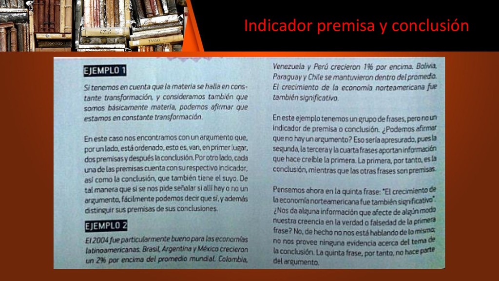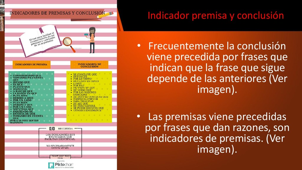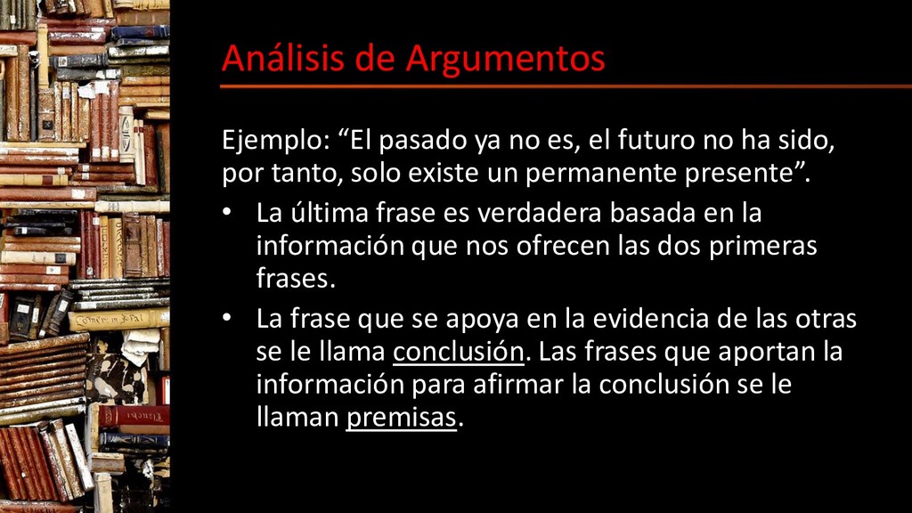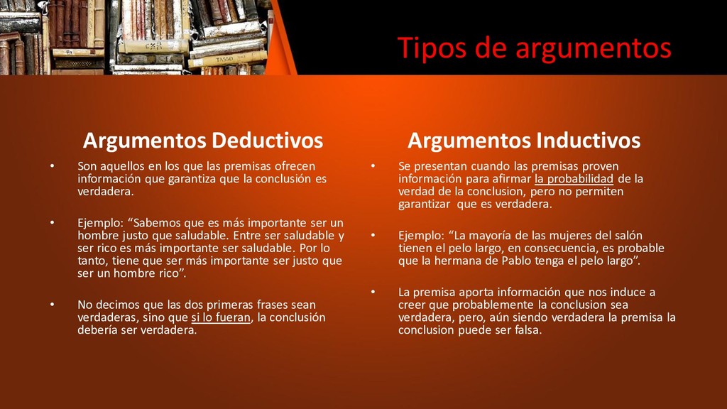 que las premisas ofrecen información que garantiza que la conclusión es verdadera. • Ejemplo: “Sabemos que es más importante ser un hombre justo que saludable. Entre ser saludable y ser rico es más importante ser saludable. Por lo tanto, tiene que ser más importante ser justo que ser un hombre rico”. • No decimos que las dos primeras frases sean verdaderas, sino que si lo fueran, la conclusión debería ser verdadera. Argumentos Inductivos • Se presentan cuando las premisas proven información para afirmar la probabilidad de la verdad de la conclusion, pero no permiten garantizar que es verdadera. • Ejemplo: “La mayoría de las mujeres del salón tienen el pelo largo, en consecuencia, es probable que la hermana de Pablo tenga el pelo largo”. • La premisa aporta información que nos induce a creer que probablemente la conclusion sea verdadera, pero, aún siendo verdadera la premisa la conclusion puede ser falsa.