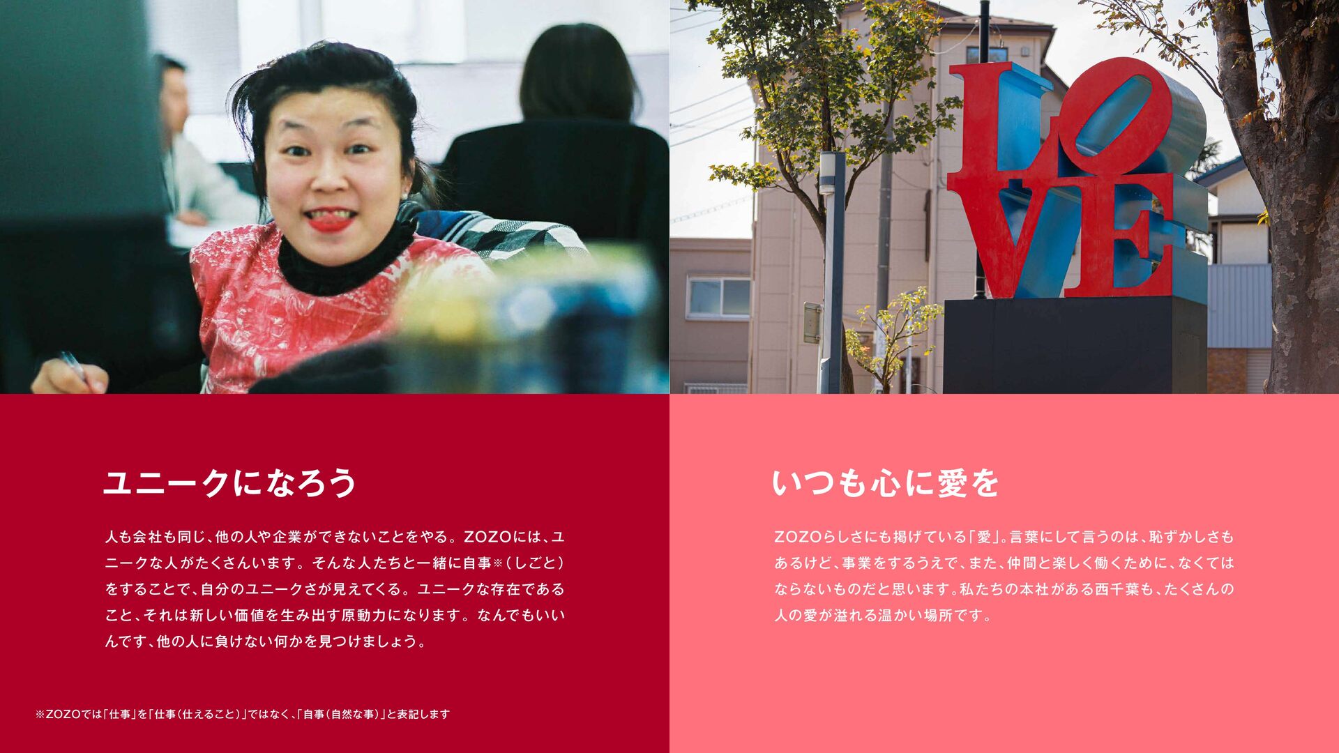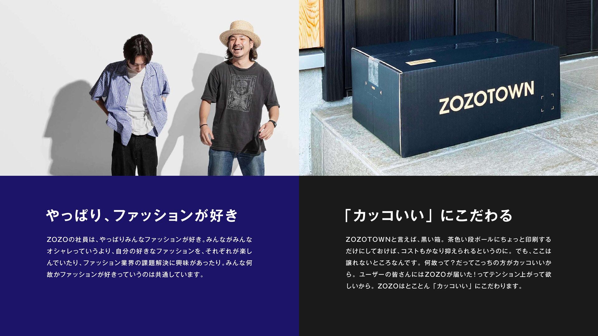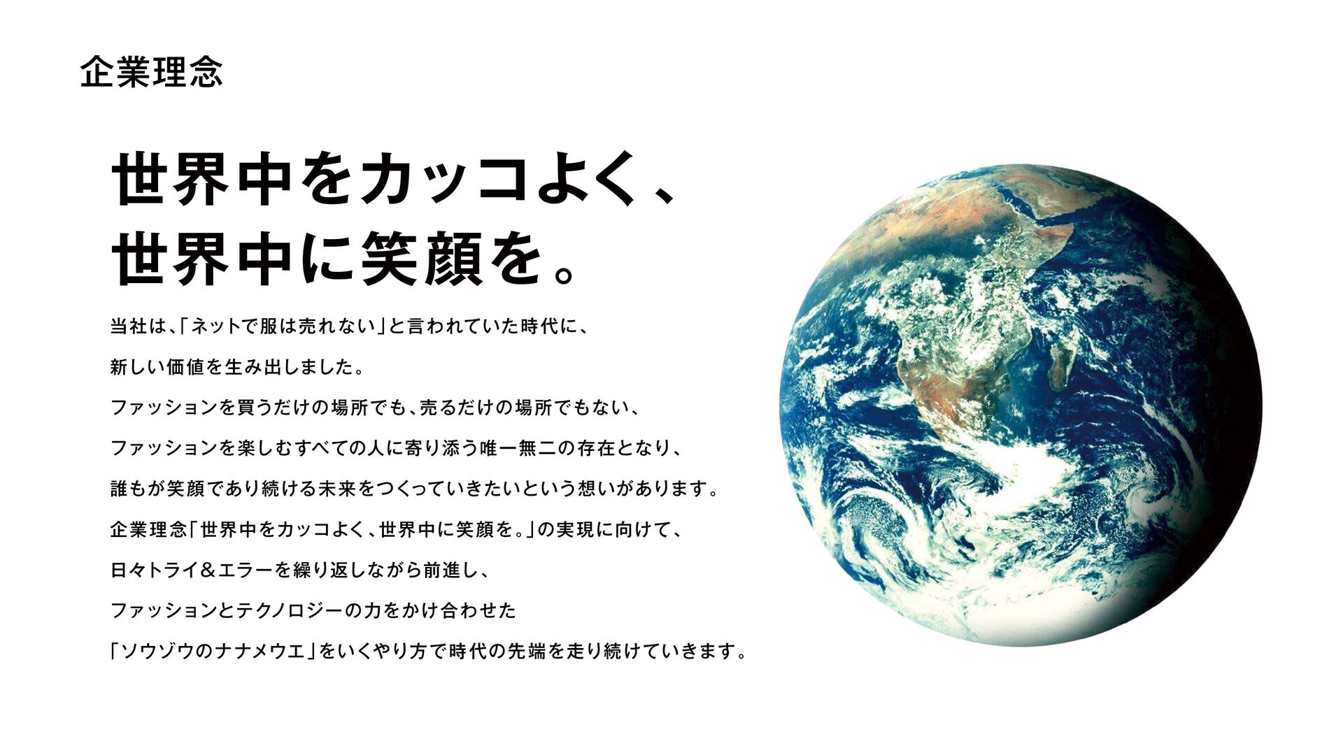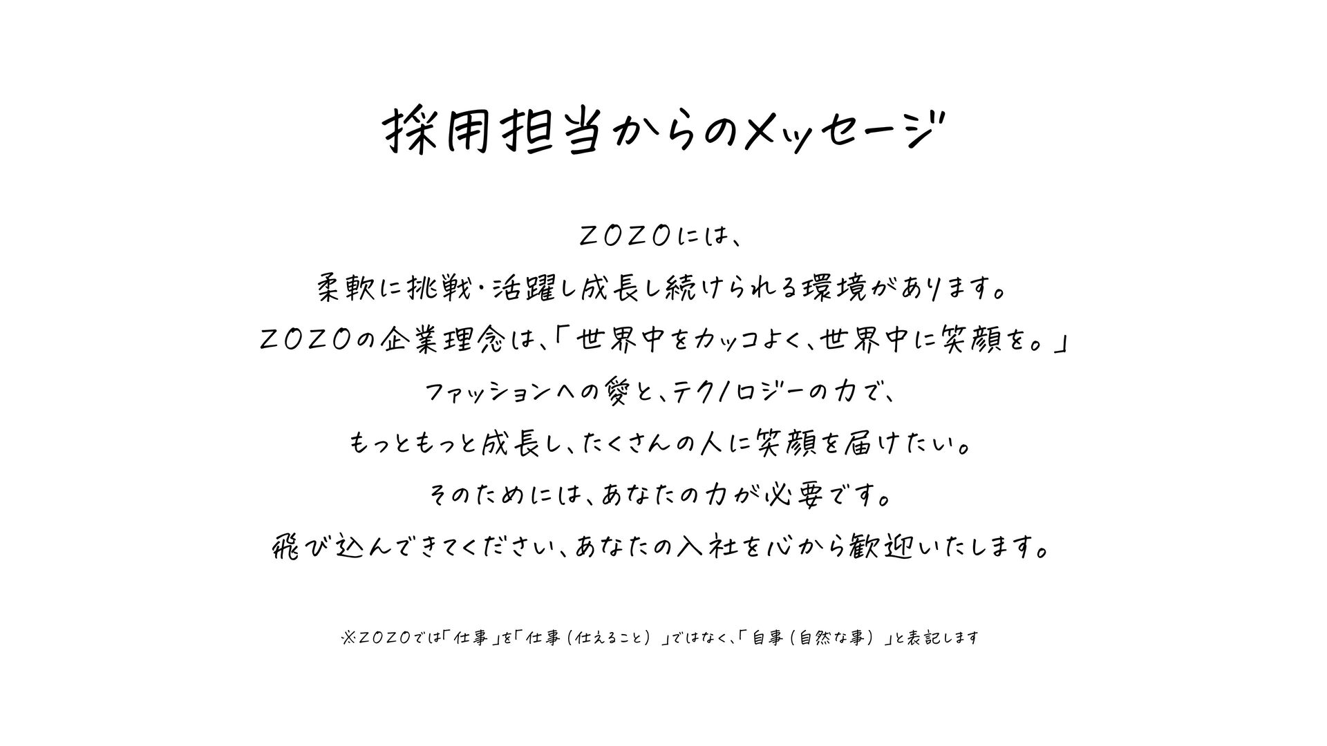 ZOZOの企業理念は、 「世界中をカッコよく、世界中に笑顔を。」 ファッションへの愛と、テクノロジーの力で、 もっともっと成長し、たくさんの人に笑顔を届けたい。 そのためには、あなたの力が必要です。 飛び込んできてください、あなたの入社を心から歓迎いたします。
