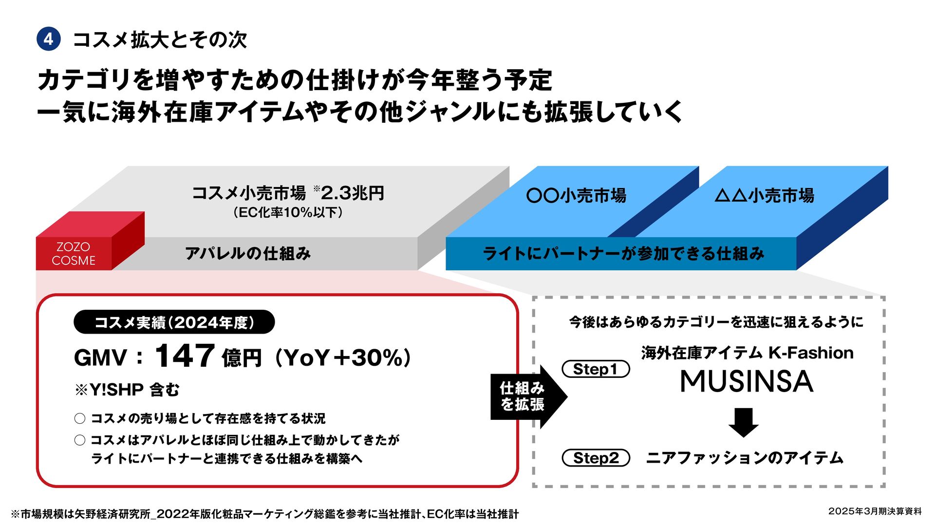 ԯԁʢ:P: ʣ ˓ίεϝͷചΓ৔ͱͯ͠ଘࡏײΛ࣋ͯΔঢ়گ ˓ίεϝ͸ΞύϨϧͱ΄΅ಉ͡࢓૊Έ্Ͱಈ͔͖͕ͯͨ͠ ϥΠτʹύʔτφʔͱ࿈ܞͰ͖Δ࢓૊ΈΛߏங΁ ˞:4)1ؚΉ ࠓޙ͸͋ΒΏΔΧςΰϦʔΛਝ଎ʹૂ͑ΔΑ͏ʹ 4UFQ 4UFQ ւ֎ࡏݿΞΠςϜ,'BTIJPO χΞϑΝογϣϯͷΞΠςϜ ΧςΰϦΛ૿΍ͨ͢Ίͷ࢓ֻ͚͕ࠓ೥੔͏༧ఆ Ұؾʹւ֎ࡏݿΞΠςϜ΍ͦͷଞδϟϯϧʹ΋֦ு͍ͯ͘͠ ΞύϨϧͷ࢓૊Έ ϥΠτʹύʔτφʔ͕ࢀՃͰ͖Δ࢓૊Έ ࢓૊Έ Λ֦ு 4 ˞ࢢ৔ن໛͸໼໺ܦࡁݚڀॴ@೥൛Խহ඼ϚʔέςΟϯά૯ؑΛࢀߟʹ౰ࣾਪܭɺ &$Խ཰͸౰ࣾਪܭ ίεϝ࣮੷ ʢ೥౓ʣ 30 ೥݄ظܾࢉࢿྉ