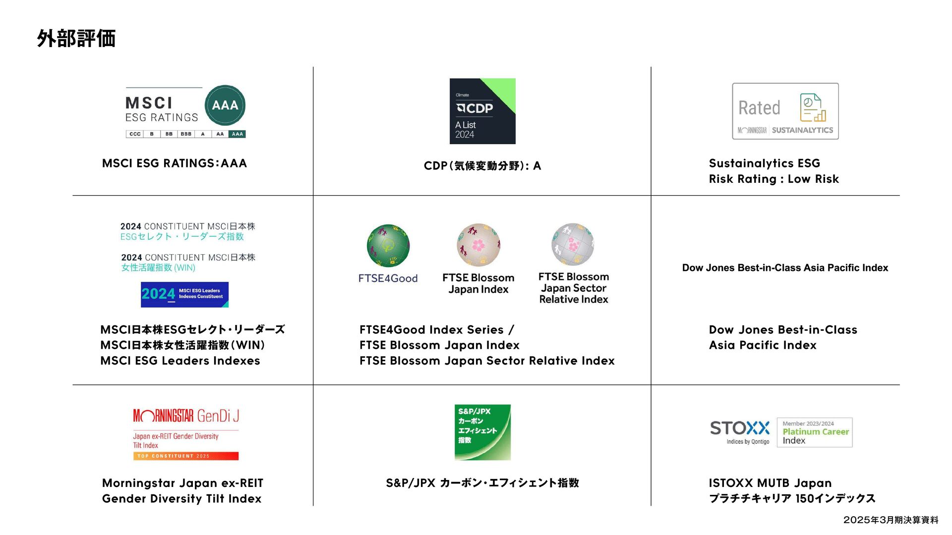 MSCI ESG Leaders Indexes Morningstar Japan ex-REIT Gender Diversity Tilt Index CDP ʢؾީมಈ෼໺ʣ : A FTSE4Good Index Series / FTSE Blossom Japan Index FTSE Blossom Japan Sector Relative Index Dow Jones Best-in-Class Asia Pacific Index S&P/JPX ΧʔϘϯɾΤϑΟγΣϯτࢦ਺ Sustainalytics ESG Risk Rating : Low Risk ISTOXX MUTB Japan ϓϥννΩϟϦΞ 150ΠϯσοΫε 32 ೥݄ظܾࢉࢿྉ