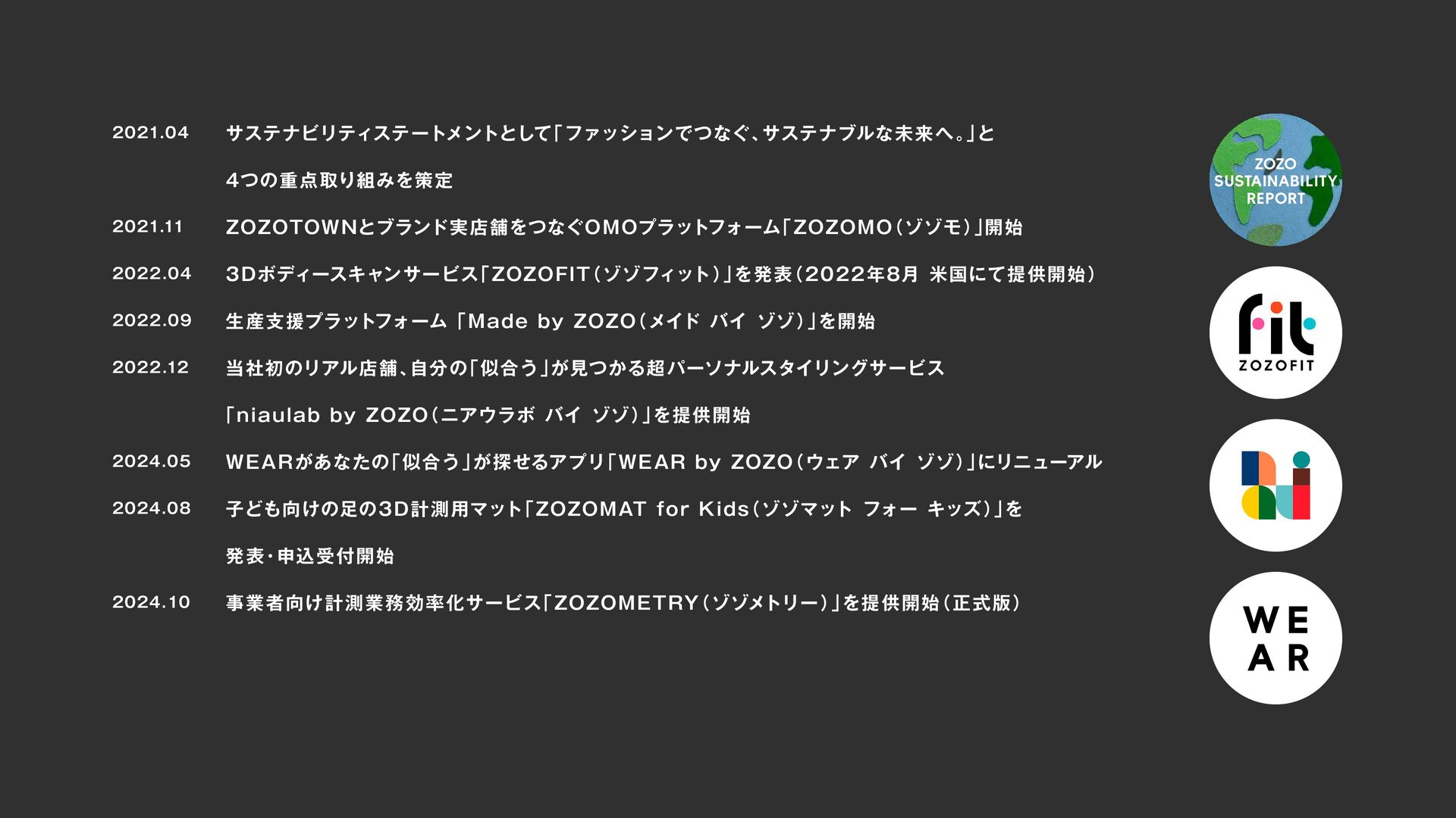 גࣜձࣾ;0;0ςΫϊϩδʔζΛٵऩ෼ׂ͠ɺ ෼ׂձࣾΛ ʮגࣜձࣾ;0;0/&95ʯ ʹ঎߸มߋ खࢦͷ%ܭଌ༻πʔϧ ʮ;0;0."5GPS)BOET ʢκκϚοτϑΥʔϋϯζʣ ʯ Λൃද ;0;0508/ͱϒϥϯυ࣮ళฮΛͭͳ͙0.0ϓϥοτϑΥʔϜ ʮ;0;0.0 ʢκκϞʣ ʯ ։࢝ ϘσΟʔϚωδϝϯταʔϏε ʮ;0;0'*5 ʢκκϑΟοτʣ ʯ Λൃද ʢ೥݄ถࠃʹͯఏڙ։࢝ʣ ;0;0$04.&ͰόʔνϟϧʹϝΠΫΞοϓΞΠςϜΛࢼͤΔ৽ػೳ ʮ"3ϝΠΫʯ Λఏڙ։࢝ ܦӦઓུʹ ʮϫΫϫΫͰ͖Δ ʰࣅ߹͏ʱ Λಧ͚Δʯ Λ௥Ճ 8&"3ͰϑΝογϣϯಛԽͷιʔγϟϧίϚʔεػೳΛఏڙ։࢝ γϣοϓελοϑͷൢചαϙʔτπʔϧ ʮ'""/4 ʢϑΝʔϯζʣ ʯ Λఏڙ։࢝ ʢਖ਼ࣜ൛ʣ ੜ࢈ࢧԉϓϥοτϑΥʔϜ ʮ.BEFCZ;0;0 ʢϝΠυόΠκκʣ ʯ Λ։࢝ ;0;0Β͠͞ʹ ʮ೔ʑਐาʯ ʮѪʯ Λ௥Ճ ౰ࣾॳͷϦΞϧళฮɺ ࣗ෼ͷ ʮࣅ߹͏ʯ ͕ݟ͔ͭΔ௒ύʔιφϧελΠϦϯάαʔϏε ʮOJBVMBCCZ;0;0ʯ Λఏڙ։࢝ ਓࣄ੍౓΍ख౰ɺ ಇ͖ํΛΞοϓσʔτͨ͠ɺ ৽ͨͳ ʮ;0;0803,45:-&ʯ Λ࢝ಈ ;0;0508/্ͰΞΠςϜϨϏϡʔػೳΛఏڙ։࢝ 8&"3͕͋ͳͨͷ ʮࣅ߹͏ʯ ͕୳ͤΔΞϓϦ ʮ8&"3CZ;0;0 ʢ΢ΣΞόΠκκʣ ʯ ʹϦχϡʔΞϧ         αεςφϏϦςΟεςʔτϝϯτͱͯ͠ ʮϑΝογϣϯͰͭͳ͙ɺ αεςφϒϧͳະདྷ΁ɻ ʯ ͱ ͭͷॏ఺औΓ૊ΈΛࡦఆ ;0;0508/ͱϒϥϯυ࣮ళฮΛͭͳ͙0.0ϓϥοτϑΥʔϜ ʮ;0;0.0 ʢκκϞʣ ʯ ։࢝ %ϘσΟʔεΩϟϯαʔϏε ʮ;0;0'*5 ʢκκϑΟοτʣ ʯ Λൃද ʢ೥݄ถࠃʹͯఏڙ։࢝ʣ ੜ࢈ࢧԉϓϥοτϑΥʔϜ ʮ.BEFCZ;0;0 ʢϝΠυόΠκκʣ ʯ Λ։࢝ ౰ࣾॳͷϦΞϧళฮɺ ࣗ෼ͷ ʮࣅ߹͏ʯ ͕ݟ͔ͭΔ௒ύʔιφϧελΠϦϯάαʔϏε ʮOJBVMBCCZ;0;0 ʢχΞ΢ϥϘόΠκκʣ ʯ Λఏڙ։࢝ 8&"3͕͋ͳͨͷ ʮࣅ߹͏ʯ ͕୳ͤΔΞϓϦ ʮ8&"3CZ;0;0 ʢ΢ΣΞόΠκκʣ ʯ ʹϦχϡʔΞϧ ࢠͲ΋޲͚ͷ଍ͷ%ܭଌ༻Ϛοτ ʮ;0;0."5GPS,JET ʢκκϚοτϑΥʔΩοζʣ ʯ Λ ൃදɾਃࠐड෇։࢝ ࣄۀऀ޲͚ܭଌۀ຿ޮ཰ԽαʔϏε ʮ;0;0.&53: ʢκκϝτϦʔʣ ʯ Λఏڙ։࢝ ʢਖ਼ࣜ൛ʣ ZOZO SUSTAINABILITY REPORT