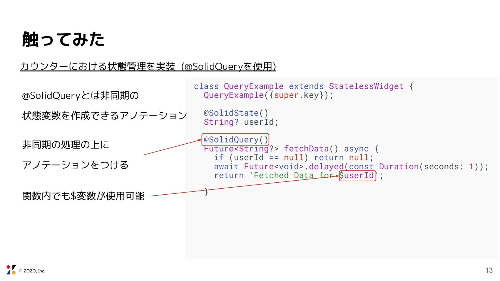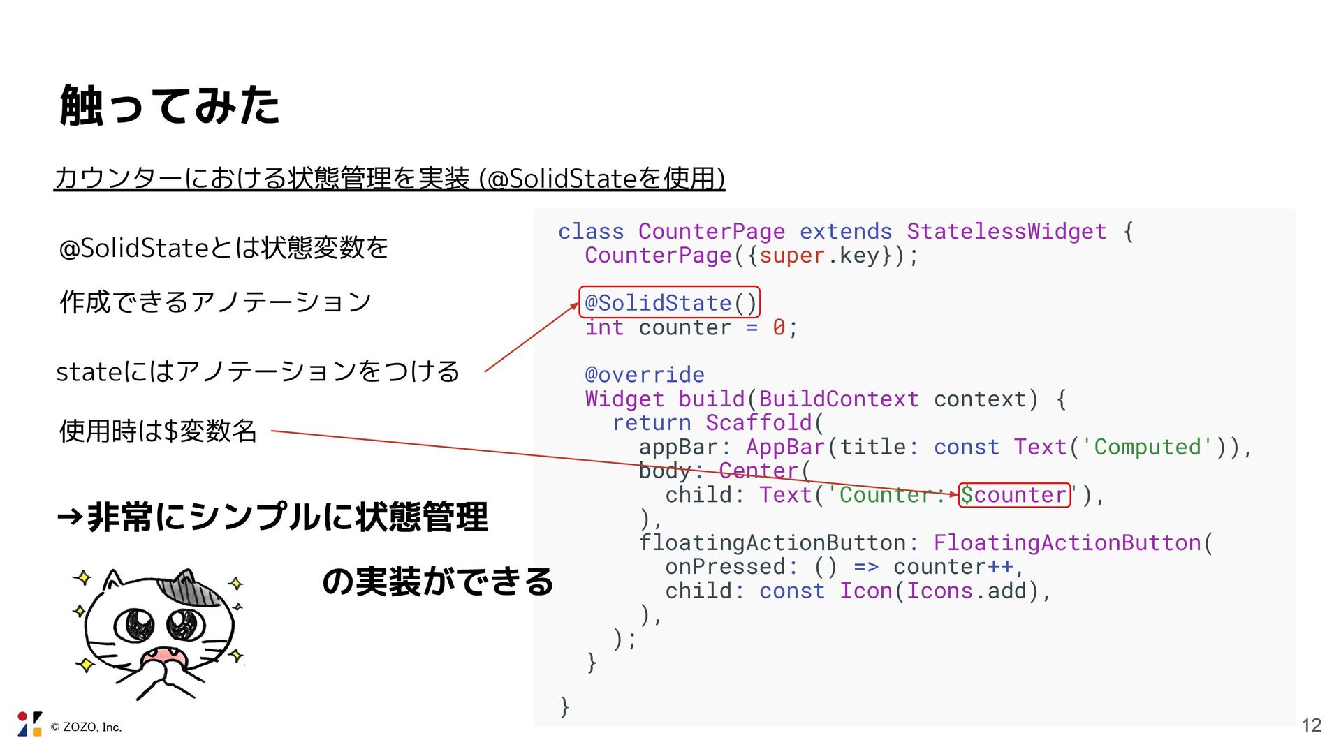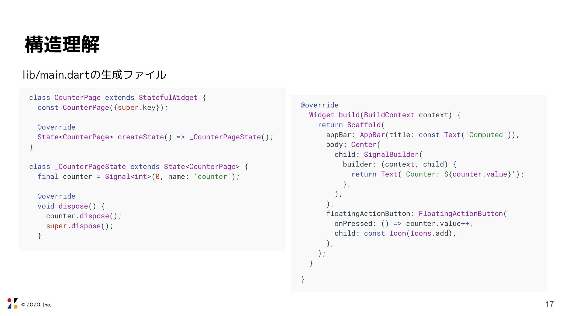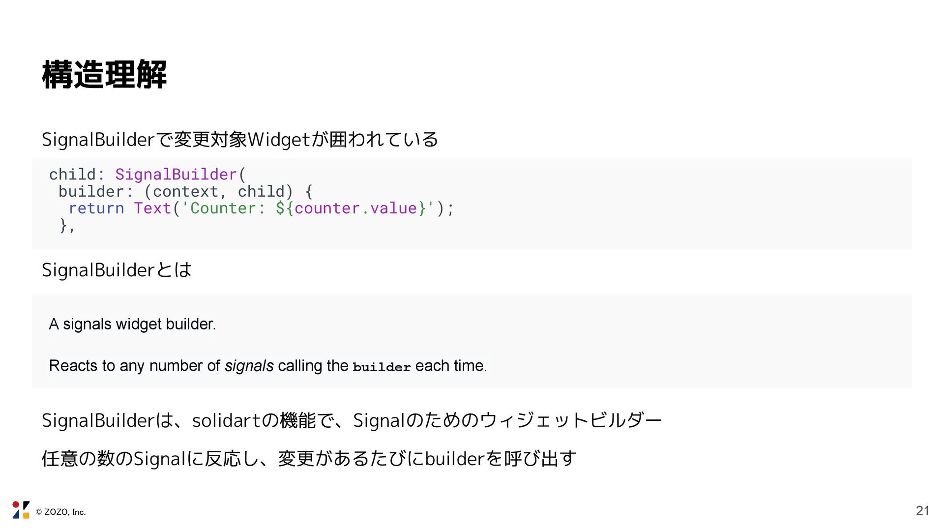 child) { return Text('Counter: ${counter.value}'); }, SignalBuilderとは A signals widget builder. Reacts to any number of signals calling the builder each time. SignalBuilderは、solidartの機能で、Signalのためのウィジェットビルダー 任意の数のSignalに反応し、変更があるたびにbuilderを呼び出す