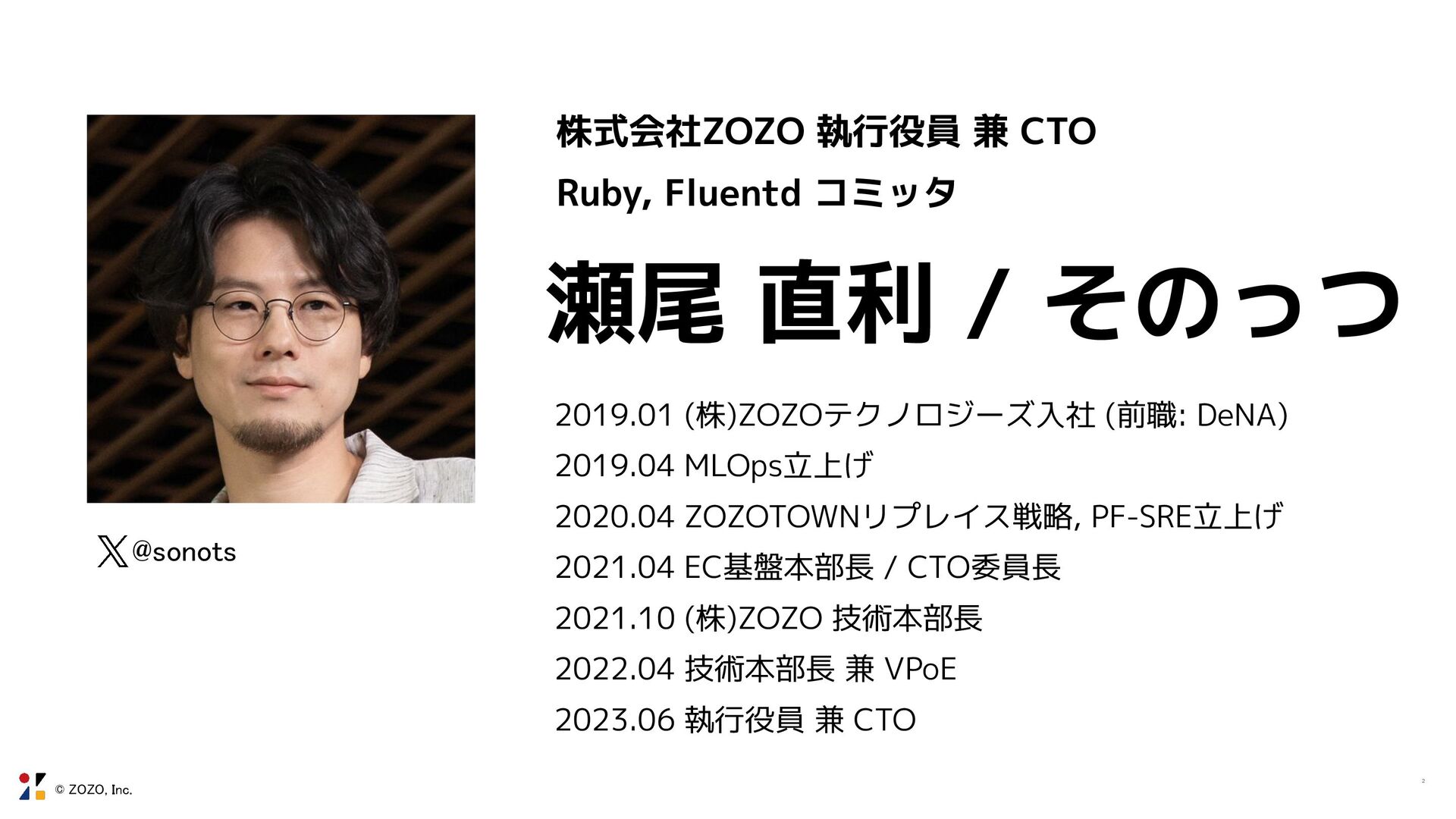 瀬尾 直利 / そのっつ 2019.01 (株)ZOZOテクノロジーズ入社 (前職: DeNA) 2019.04 MLOps立上げ 2020.04 ZOZOTOWNリプレイス戦略, PF-SRE立上げ 2021.04 EC基盤本部長 / CTO委員長 2021.10 (株)ZOZO 技術本部長 2022.04 技術本部長 兼 VPoE 2023.06 執行役員 兼 CTO 2 @sonots